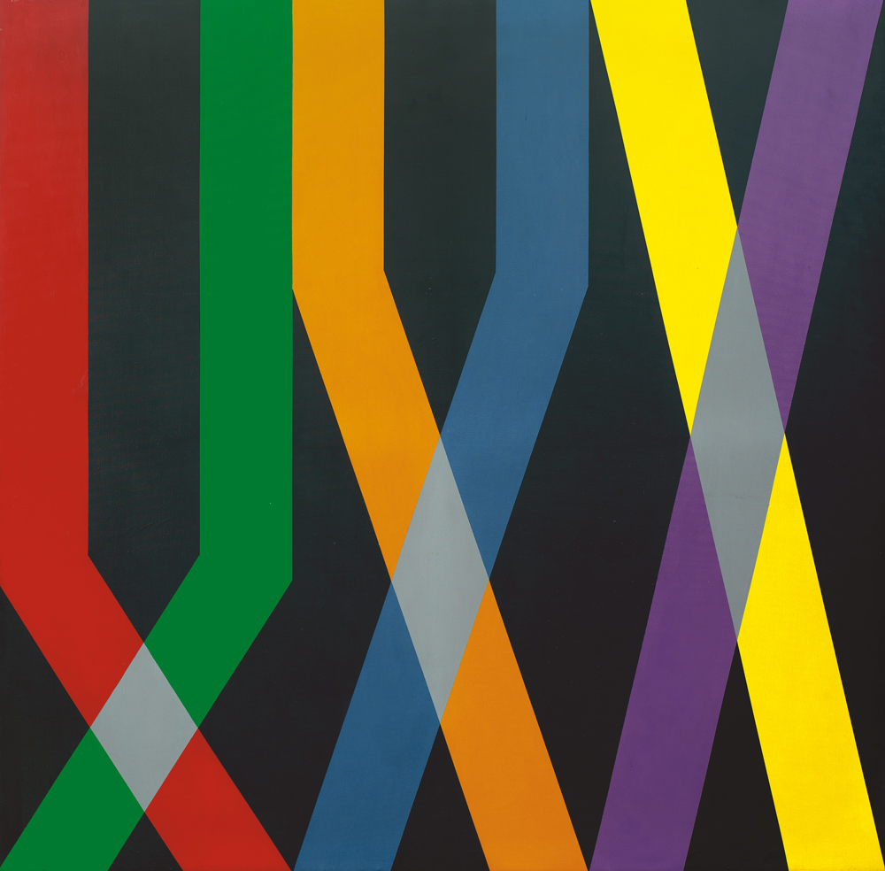 LORENZO PIEMONTI Carate Brianza (Mi) 26/04/1935 Tre tempi, variazione sul tema incrocio di colori con i complementari, 1977 acrilici su tela cm. 180x180, firma, titolo e anno al retro, dichiarazione d'autenticità e archivio dell'artista su foto, opera senza cornice.