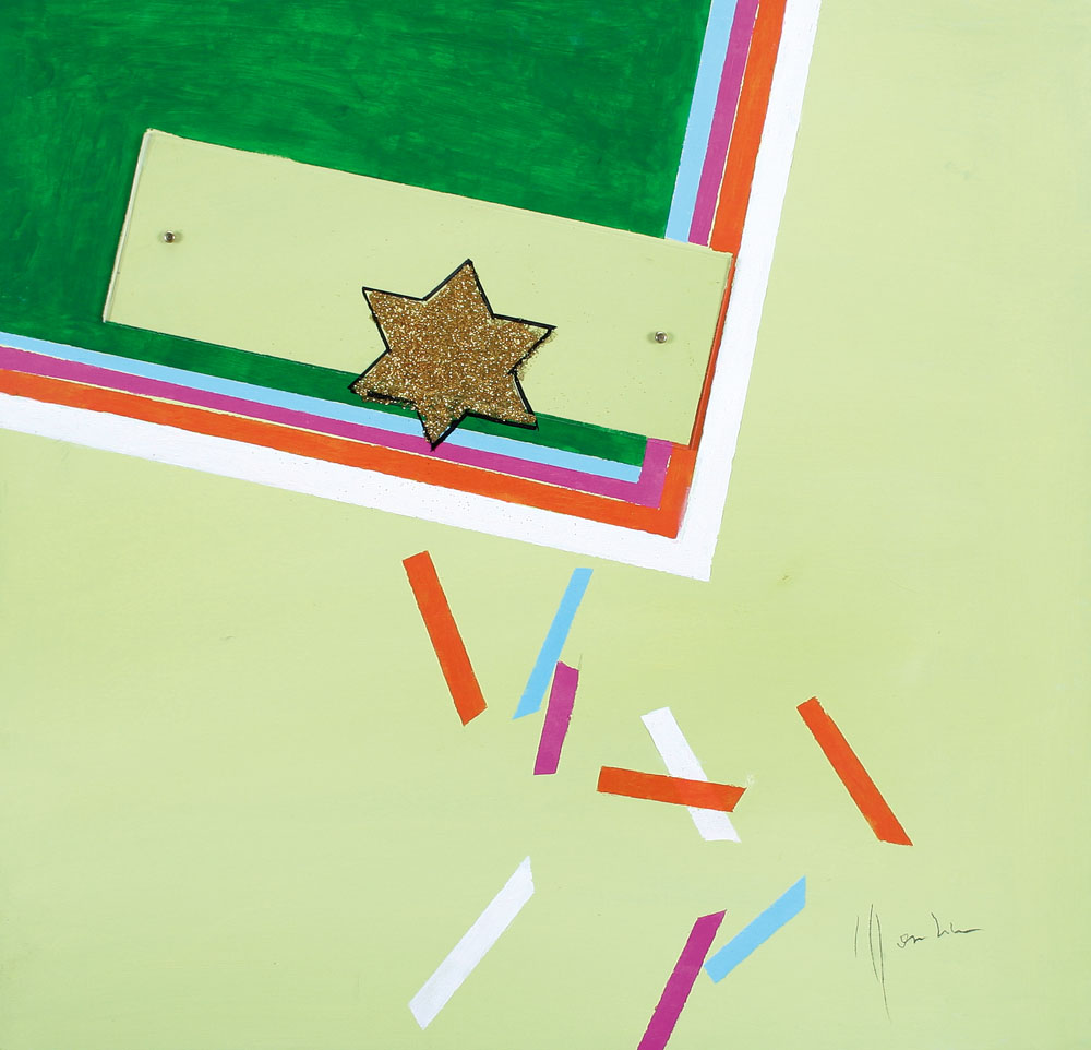ALDO MONDINO Torino 04/10/1938 - 10/03/2005 Caduta di stella tecnica mista e applicazione di perspex su tela cm. 60x62, firma in basso a destra, opera registrata presso l'Archivio Aldo Mondino come da dichiarazione allegata.