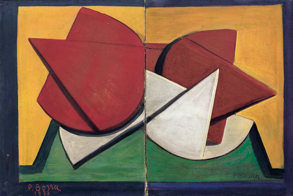 POMPEO BORRA Milano 28/01/1898 - Milano 05/11/1973 Senza titolo, 1938 olio su due lastre di faesite cm. 69x51,5 cadauna (totale cm. 69x103), firma e anno in basso a sinistra, timbri e firme della Galleria Giraldi al retro, dichiarazione d'autenticità dell'artista su foto.