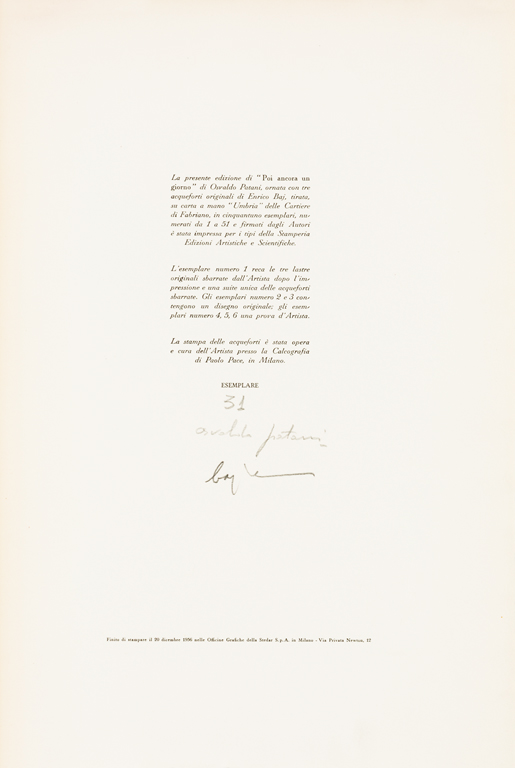Numerazione e firme di Enrico Baj e Osvaldo Patani a matita sul colophon