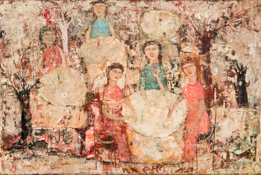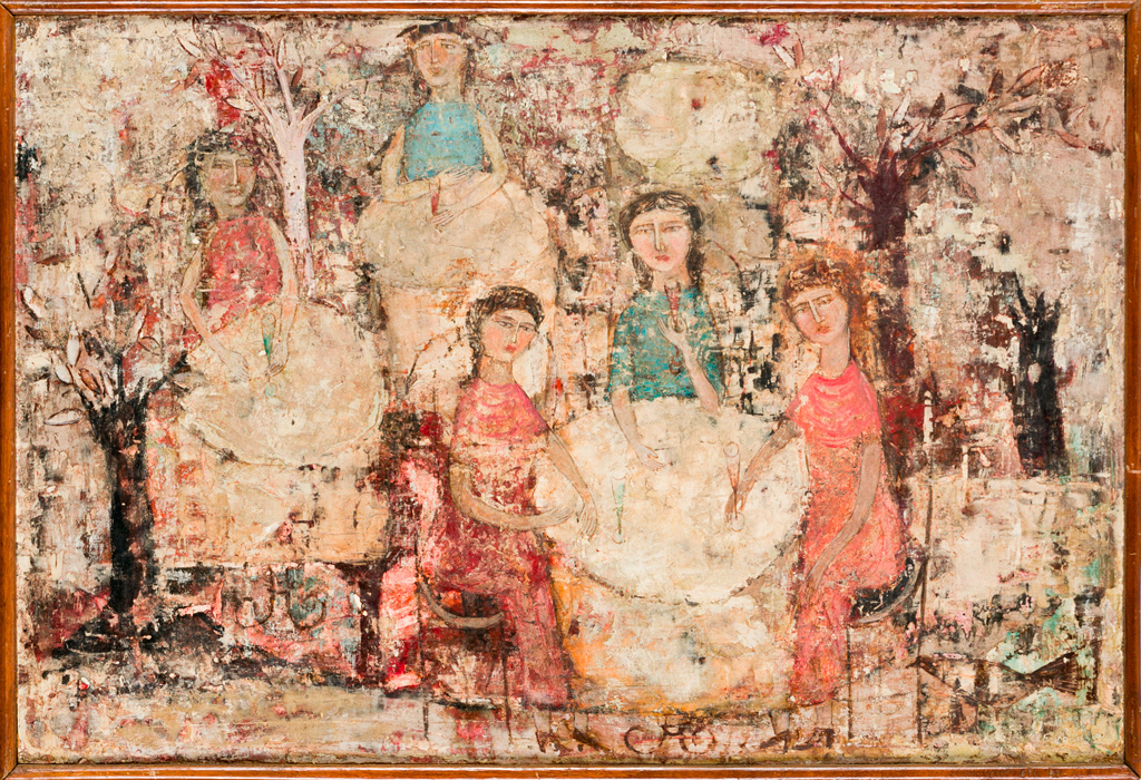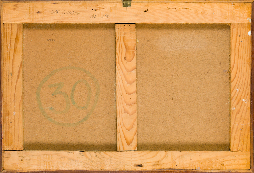 GUSTAVO FOPPIANI (1925-1986)Bar giardino, 1953Olio su tavolacm 29x42,5Firma e...