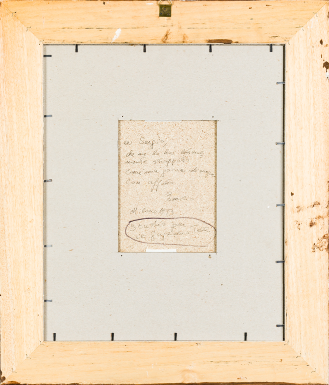 Firma, titolo, datazione, località (Milano) e dedica ad personam al retro