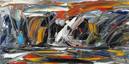 MARIO FALCHI Porto Maurizio 1950 Regata, 2010 olio su tela cm. 50x100, firma in basso a destra, titolo, firma e anno al retro, dichiarazione d'autenticità dell'artista su foto.