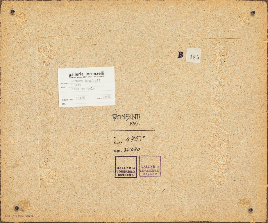 Etichetta e timbri della Galleria Lorenzelli (Milano e Bergamo) al retro