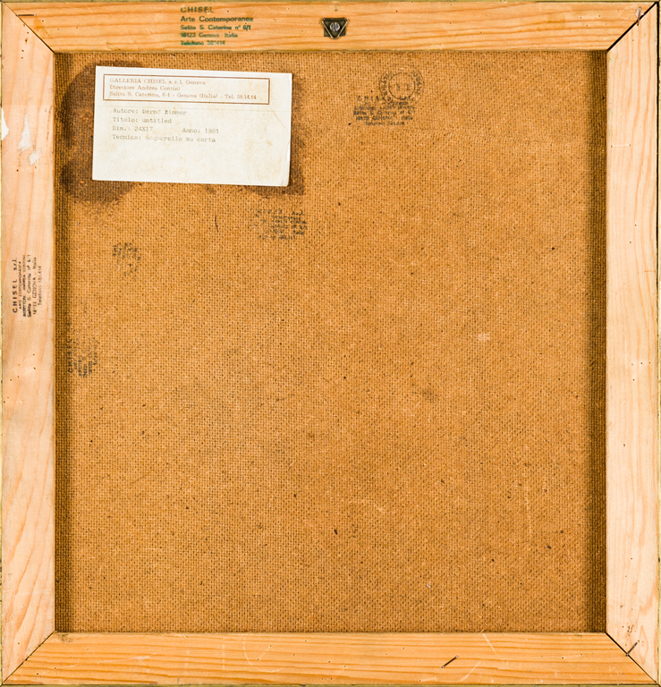 Etichetta e timbri della Galleria Chisel (GE) al retro della masonite protettiva