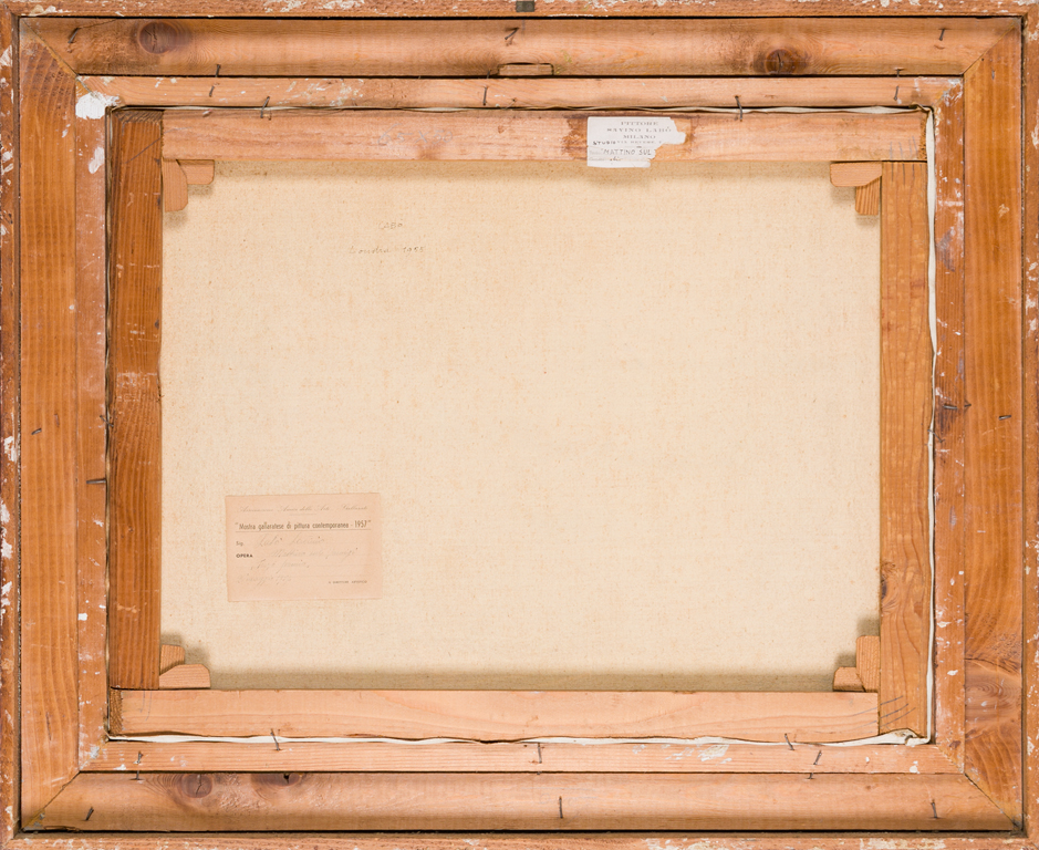Etichetta della Mostra gallaratese di Pittura contemporanea - 1957 - Associazione Amici dell'Arte - Gallarate con caratteristiche tecniche dell'opera e iscrizione 'Terzo premio', al retro