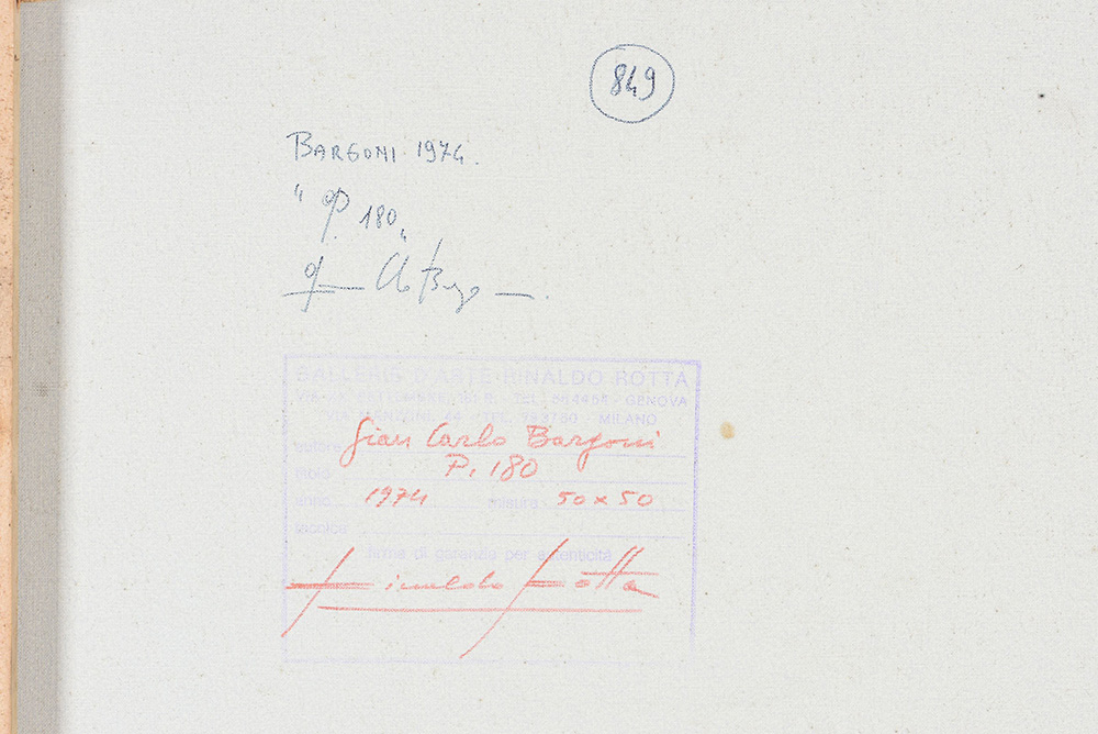Giancarlo Bargoni (1936) P. 180, 1974 olio su tela, cm 50x50 firmato, intitolato e datato al retro Timbro al retro della Galleria Rinaldo Rotta, Genova