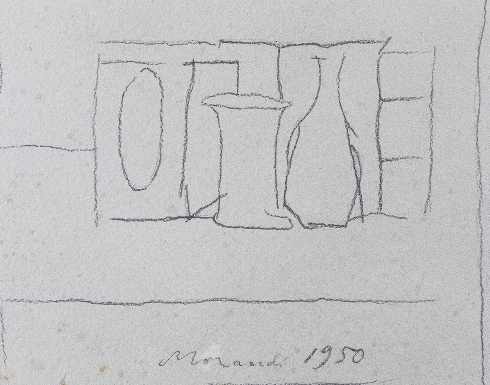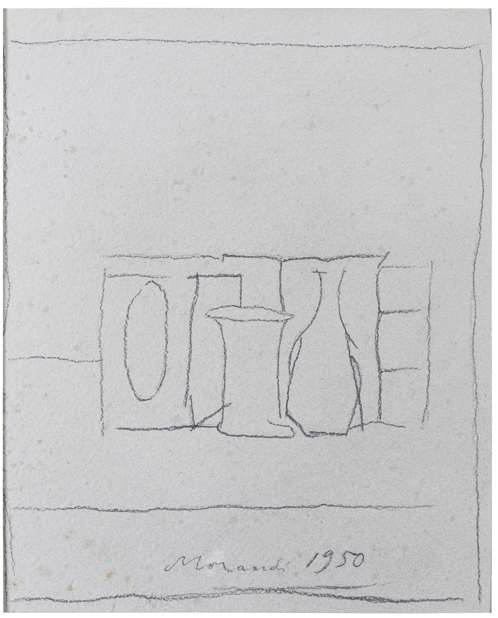 Giorgio Morandi (1890-1964) Natura morta, 1950 matita su carta, cm 28,5x22 firmato e datato in basso al centro Opera registrata presso Il Centro Studi Giorgio Morandi, Bologna, con il n. 1950/2 Provenienza: Collezione privata, Milano Bibliografia: E. Tavoni, M. Pasquali, Giorgio Morandi. Disegni. Catalogo generale, Milano, Electa, 1994 p. 108 Foxing in corrispondenza dell’angolo inferiori sinistro.