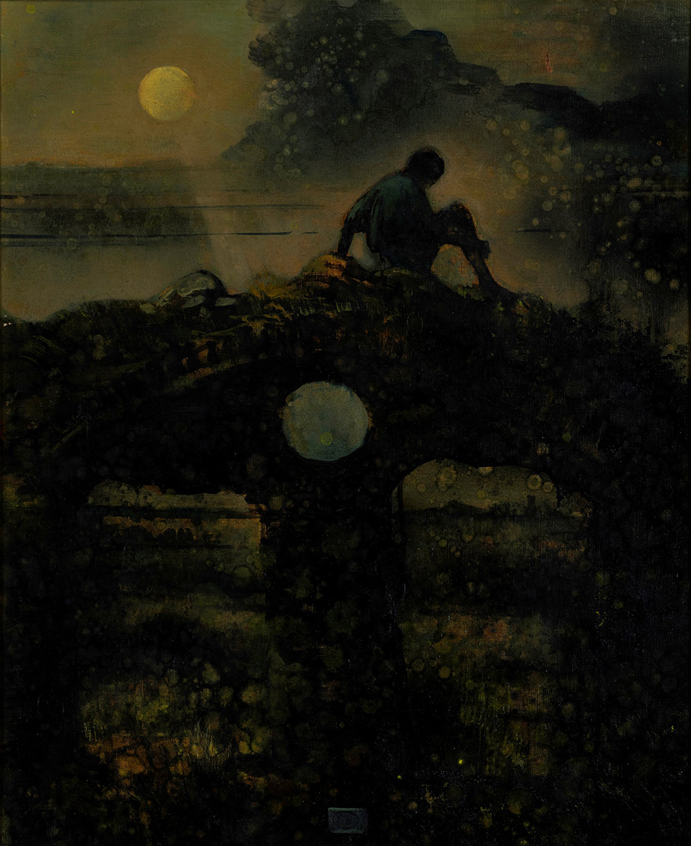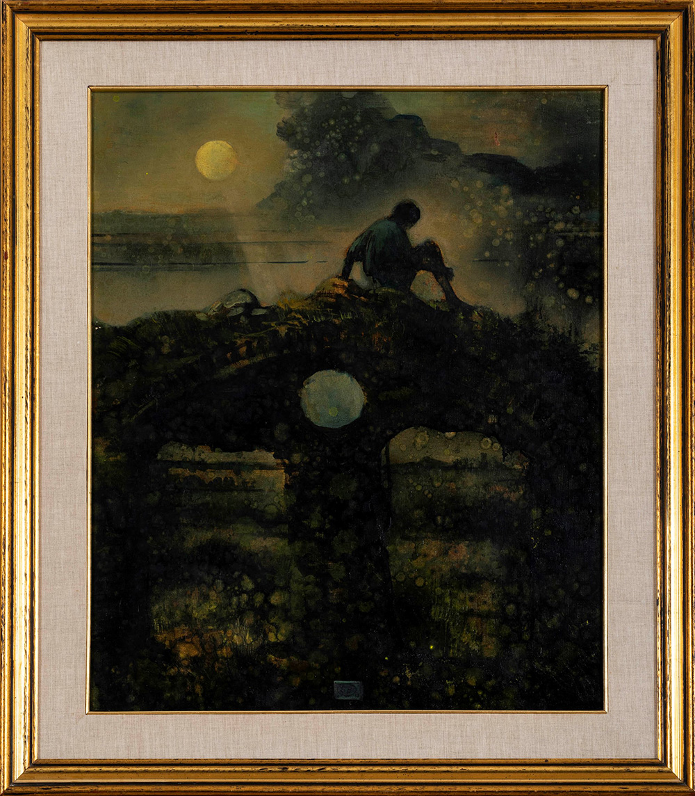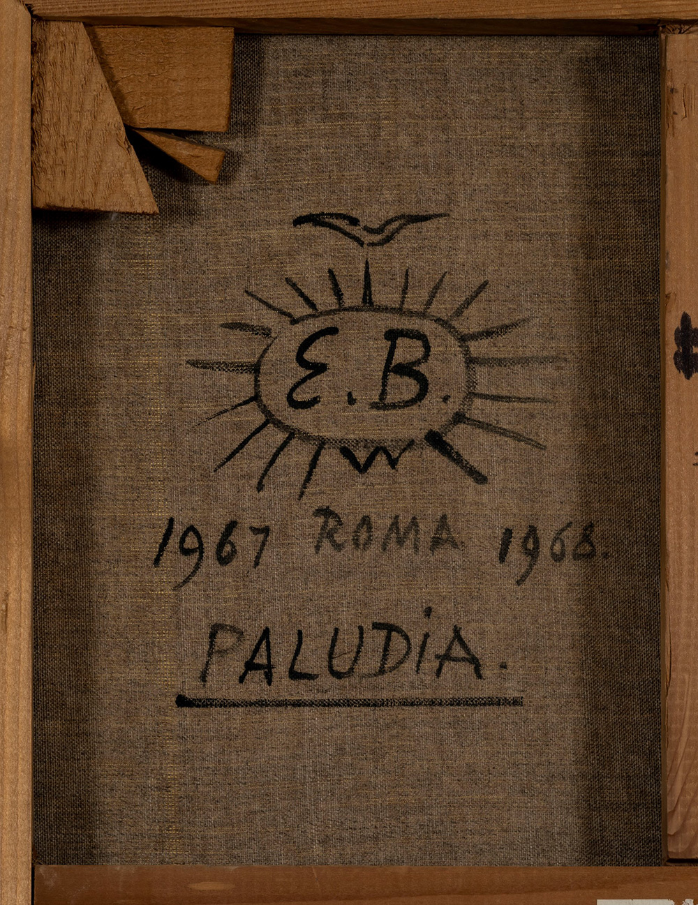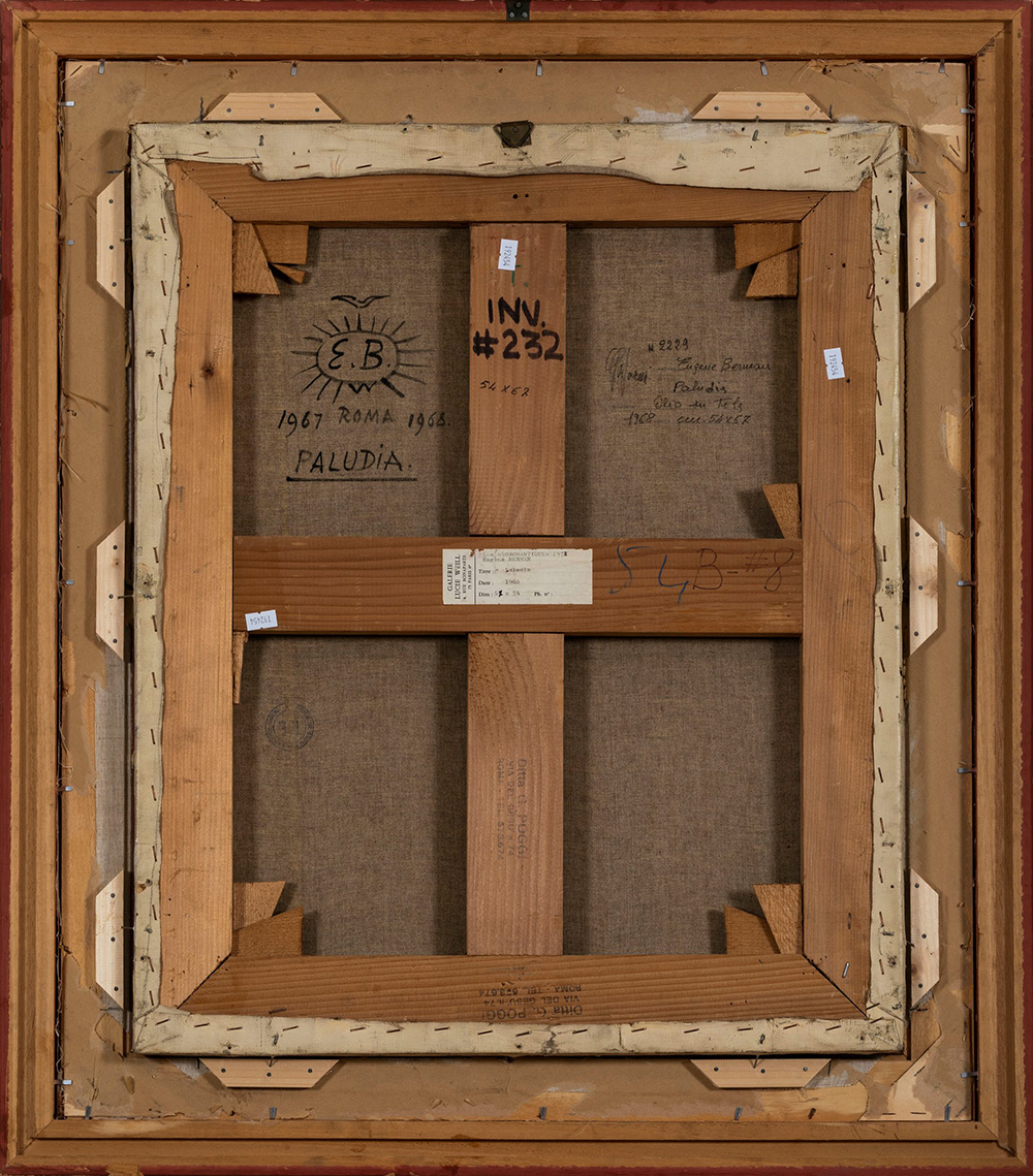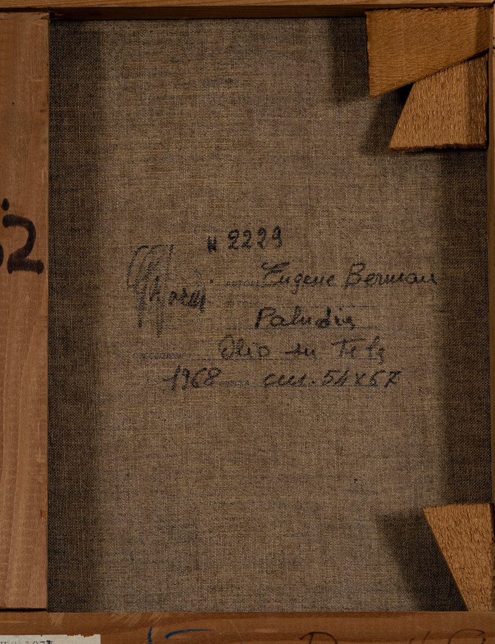Eugene Gustavovitch Berman (1899-1972) Paludia, 1968 olio su tela, cm 67x54 siglato e datato in basso al centro siglato, intitolato e datato al retro Etichetta e timbro al retro della Galleria Lucie Weill, Parigi Timbro al retro della Galleria Forni, Bologna Provenienza: Galleria Lucie Weill, Parigi Galleria Forni, Bologna Collezione privata, Recanati Esposizioni: Les Nèo-romantiques, Galerie Lucie Weill, 25 febbraio - 24 marzo 1971 Bibliografia: Galerie Lucie Weill, Les Neò-romantiques Christian Bérard Leonid, Eugène Berman, Leonid Tchelitchew, Parigi, 1971 Patina di sporco sulla superficie, nell’angolo superiore destro vi è una mancanza. Piccole mancanze di colore in corrispondenza del bordo di sinistra, e mancanze di colore nella fascia dell’angolo inferiore di destra