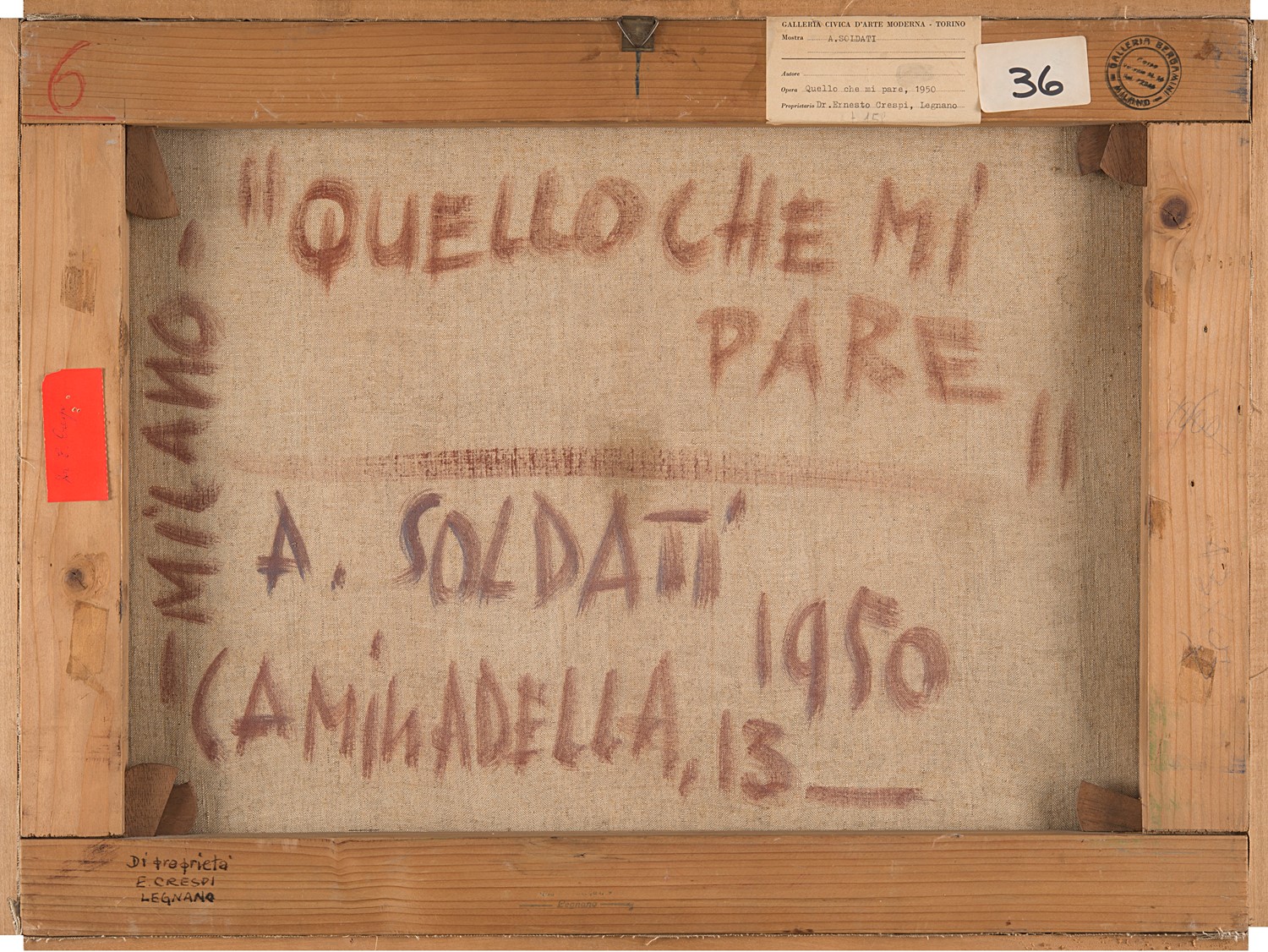 Firmato in basso a destra: SOLDATI Titolato, datato e firmato al verso: "Quello che mi pare", A. Soldati 1950