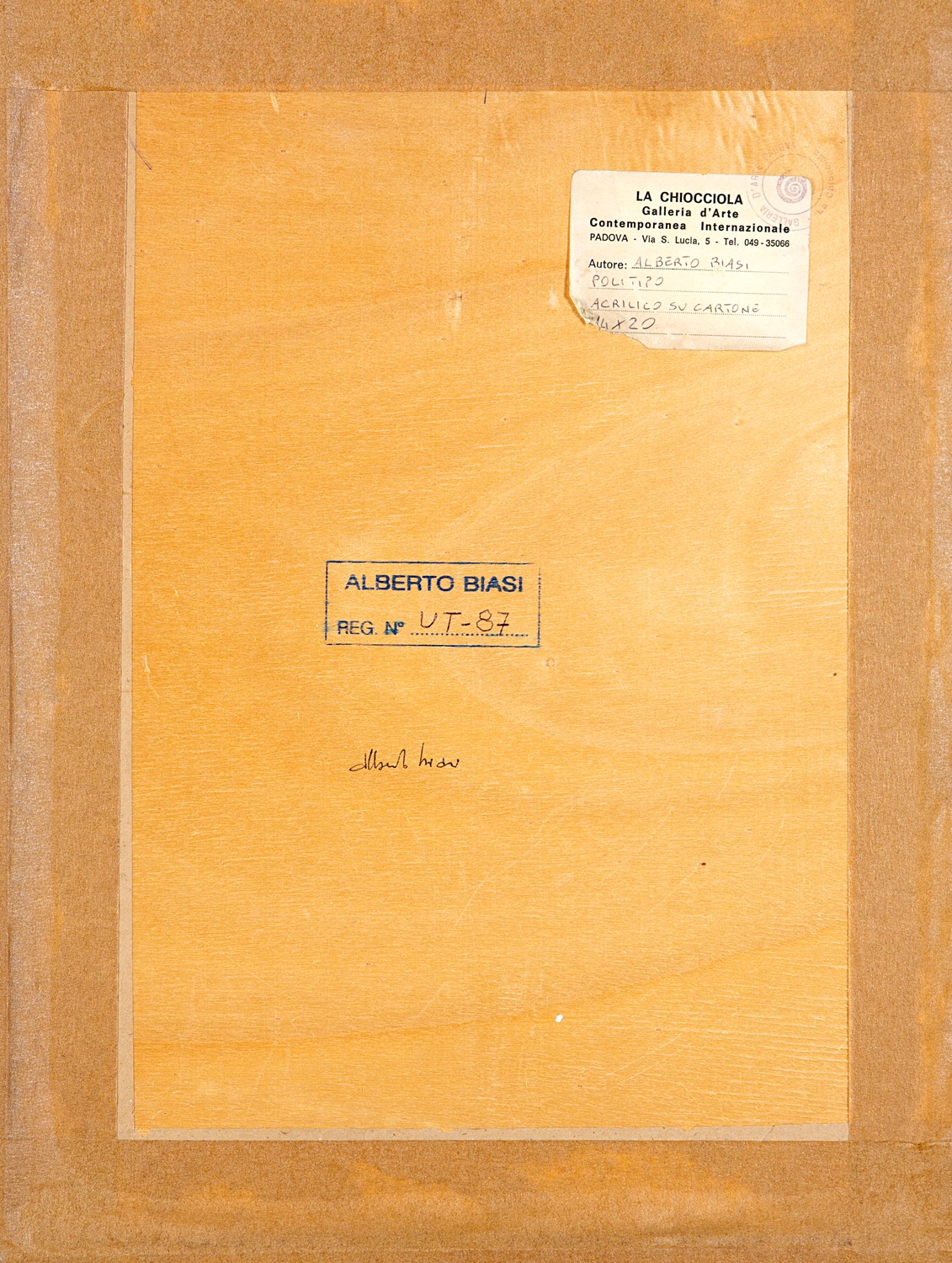 Opera registrata presso l’Archivio Alberto Biasi, Milano con il n. UT-87 come da autentica su fotografia rilasciata in data 11 gennaio 2014.