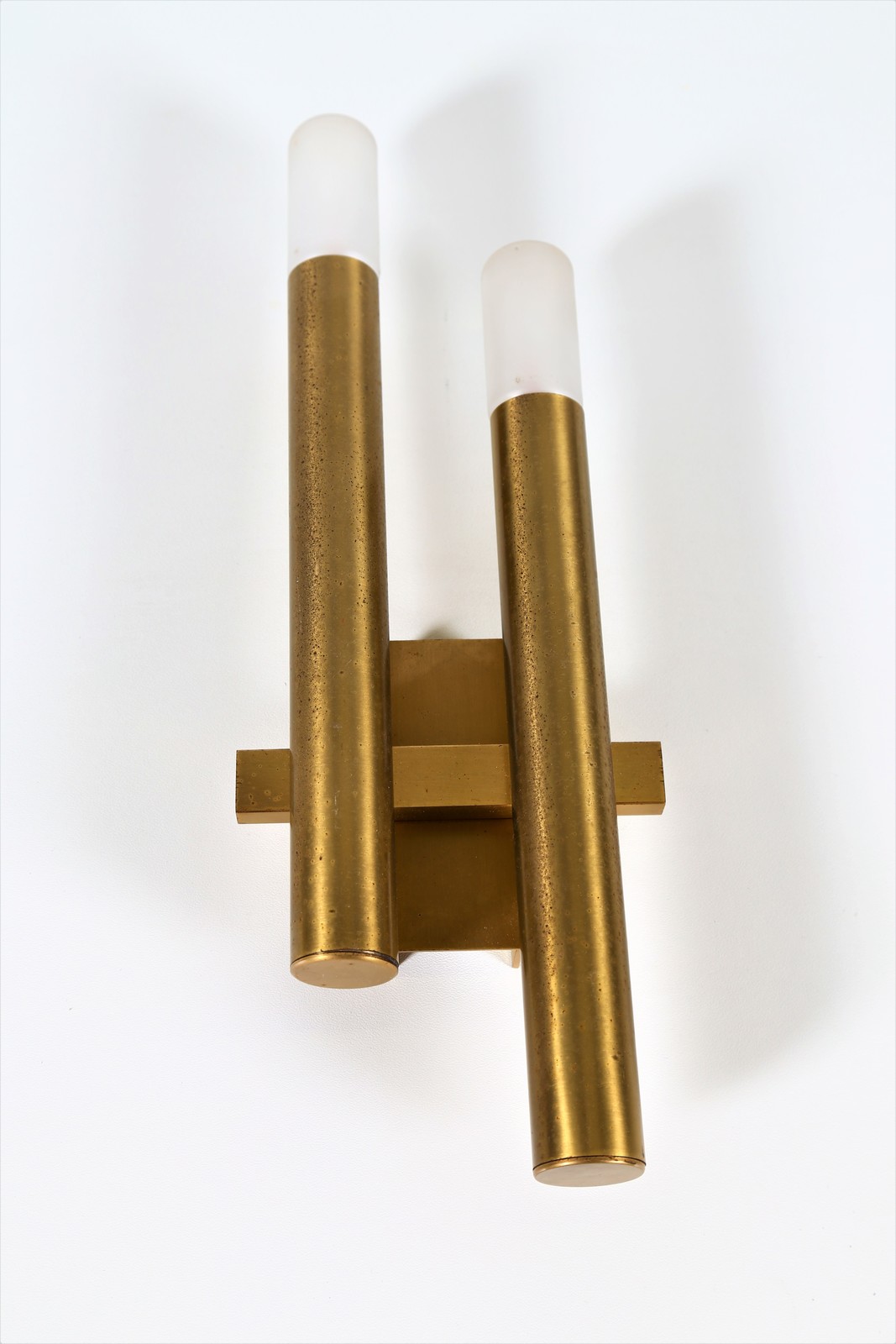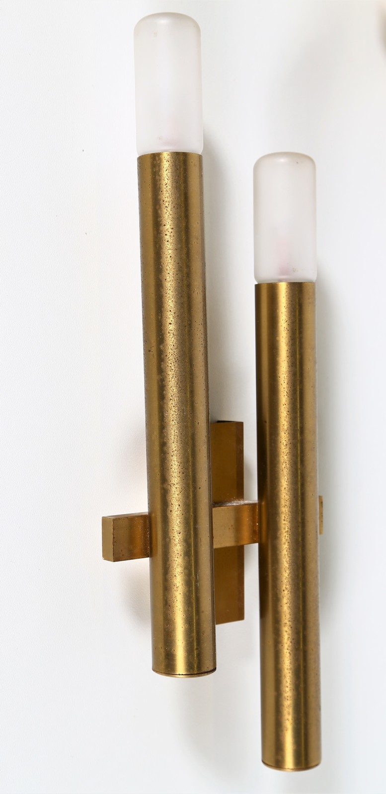 STILNOVO Pair of wall lamps. Brass and glass. Cm 13,00 x 35,00 x 5,00. Brass and glass, 60s.