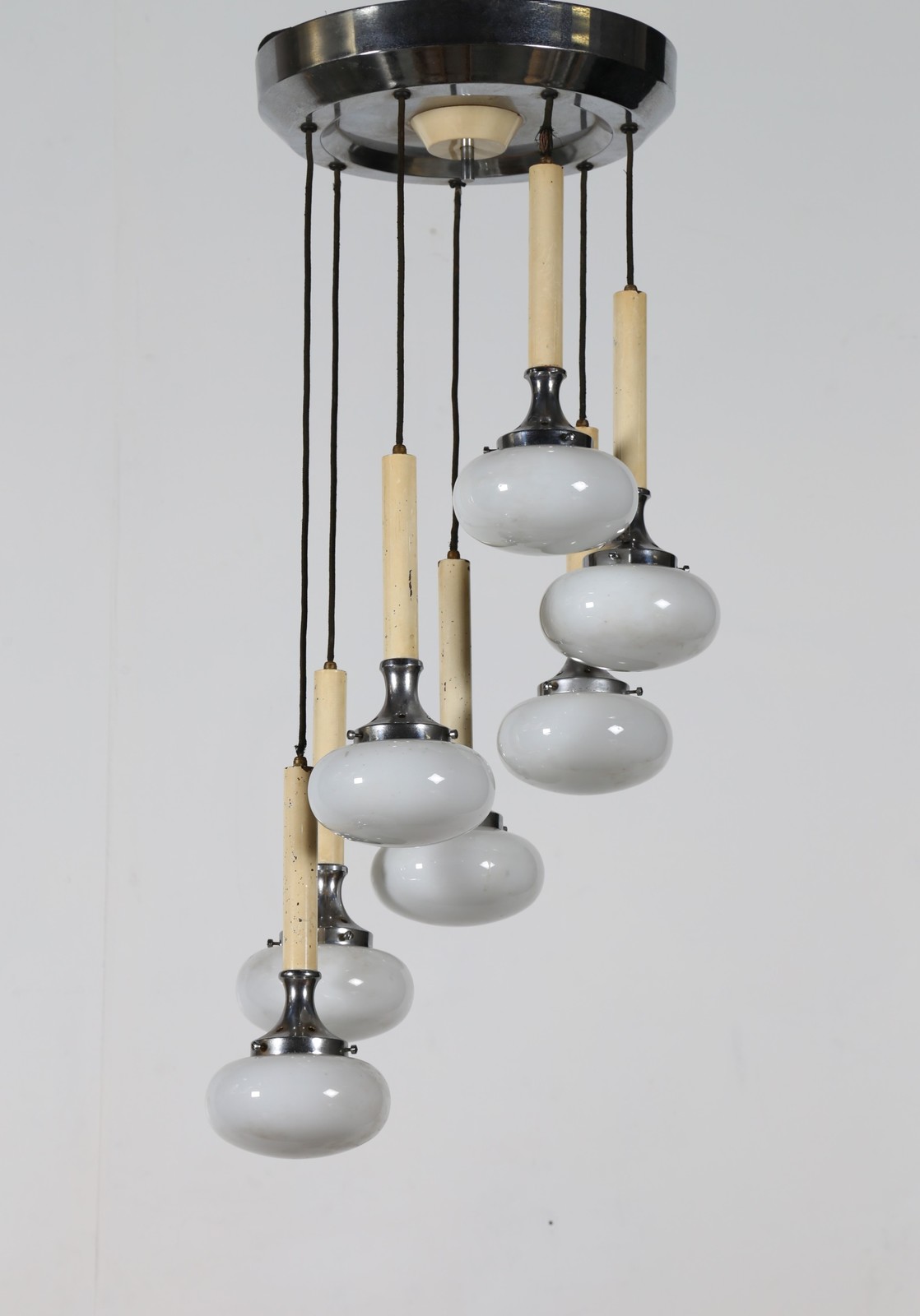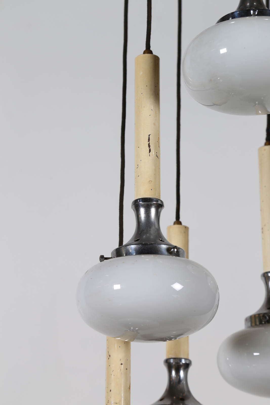 MANIFATTURA ITALIANA Lampadario sette luci. Vetro, metallo cromato e laccato....