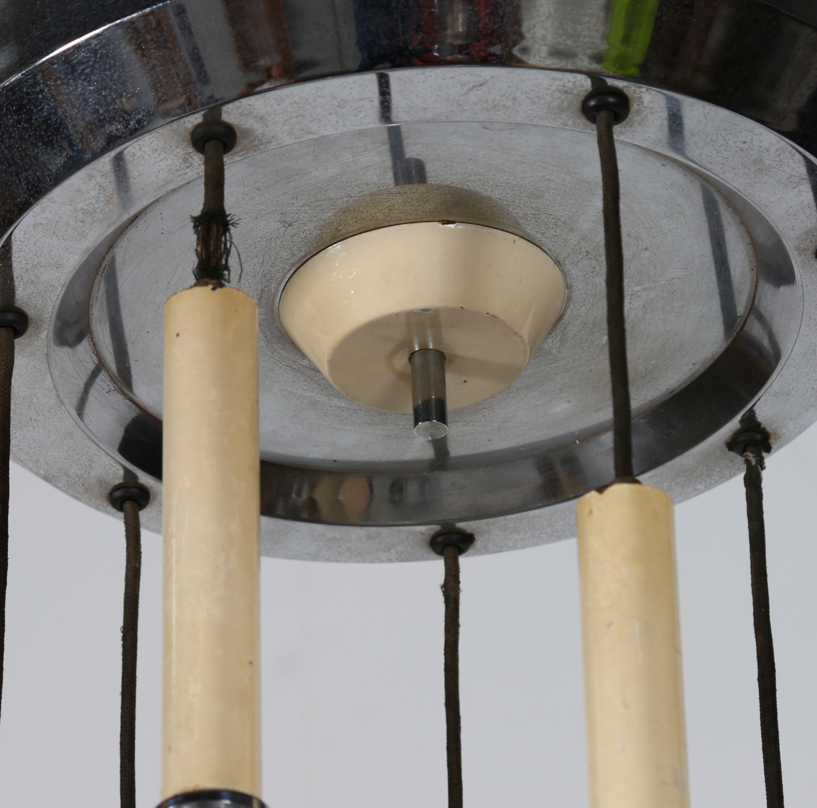 ITALIAN MANUFACTURE Seven lights chandelier. . Cm 40,00 x 100,00 x 40,00. Chromed and lacquered metal and glass.