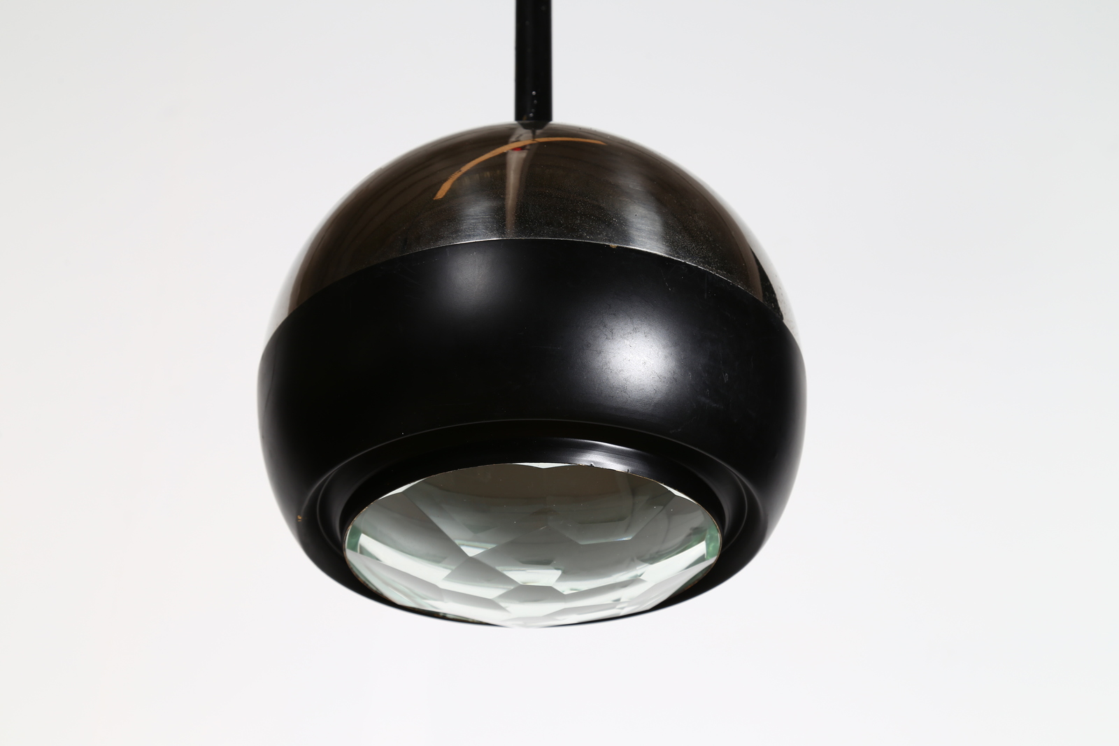 STILNOVO Coppia di lampade a sospensione. Vetro, metallo cromato e laccato. Cm 26,00 x 42,00 x 26,00. Metallo laccato, metallo cromato e vetro, anni 60.