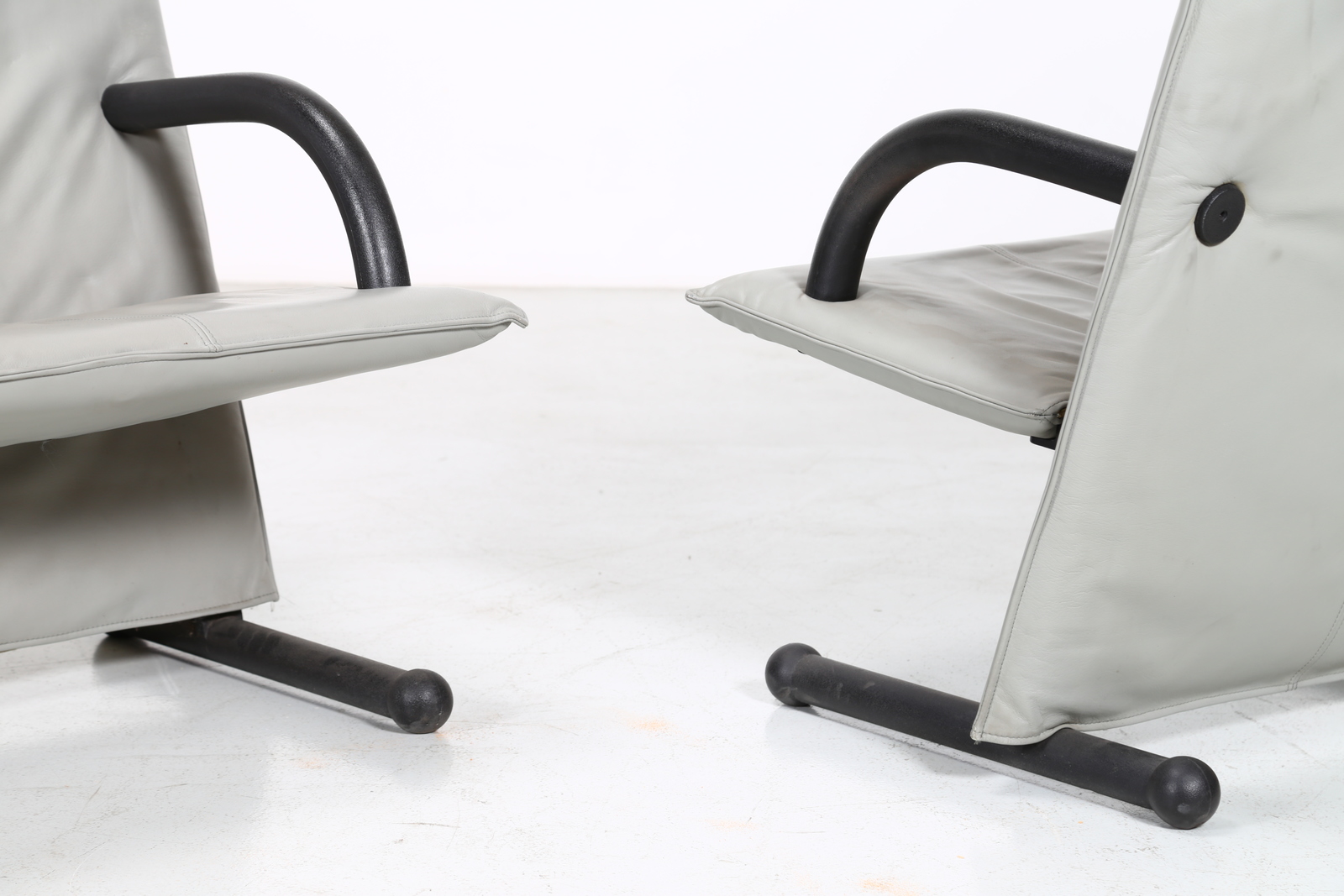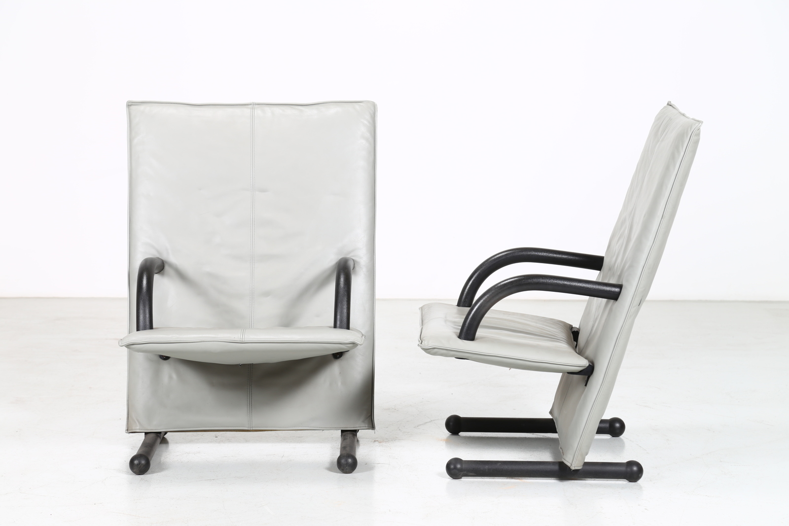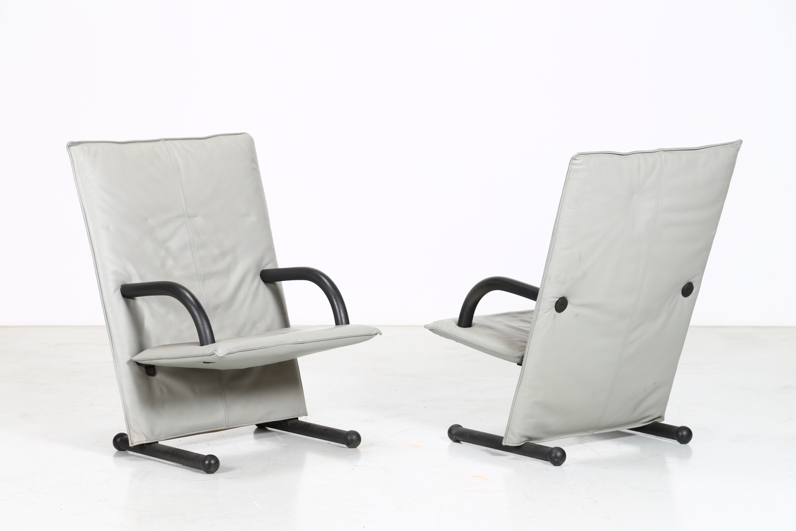 BURKHARD VOGTHERR Coppia di poltrone mod. T-Line. Pelle e ferro. Cm 76,00 x 101,00 x 76,00. Pelle e ferro, per Artflex, etichetta presente, 1984.