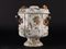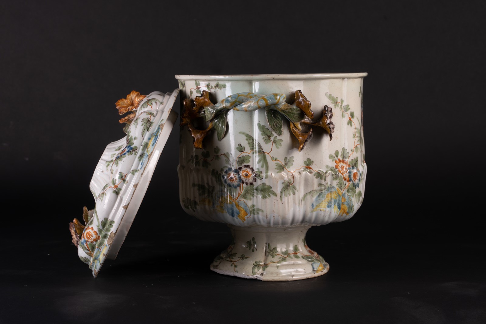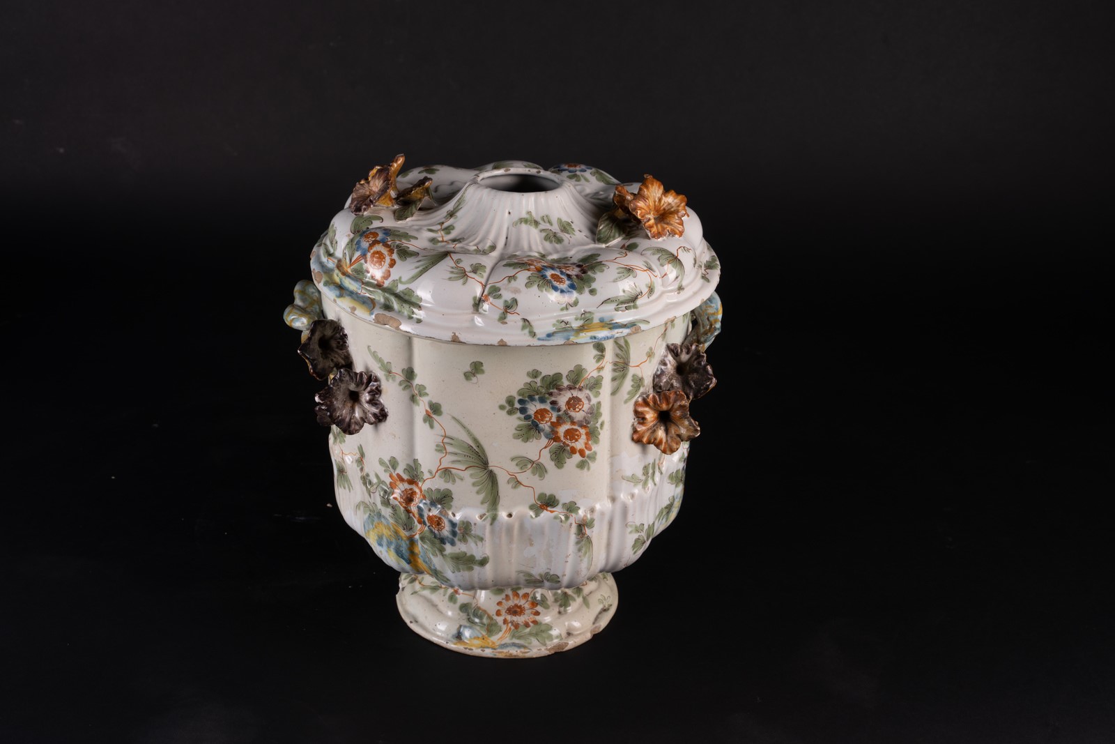 18th CENTURY VENETO MANUFACTURE Large ceramic flower vase with circular ribbed base, grooved body surmounted by a lid to a hole. . Cm 28,00 x 28,00. Handles and lid decorated with floral motifs. Polychrome decoration of flowers leaves. Chipping.