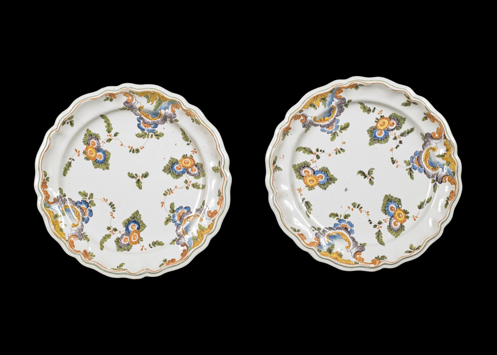 18th CENTURY VENETO MANUFACTURE A pair of shaped plates in polychrome ceramic decorated with flowers motifs. . Cm 22,00.