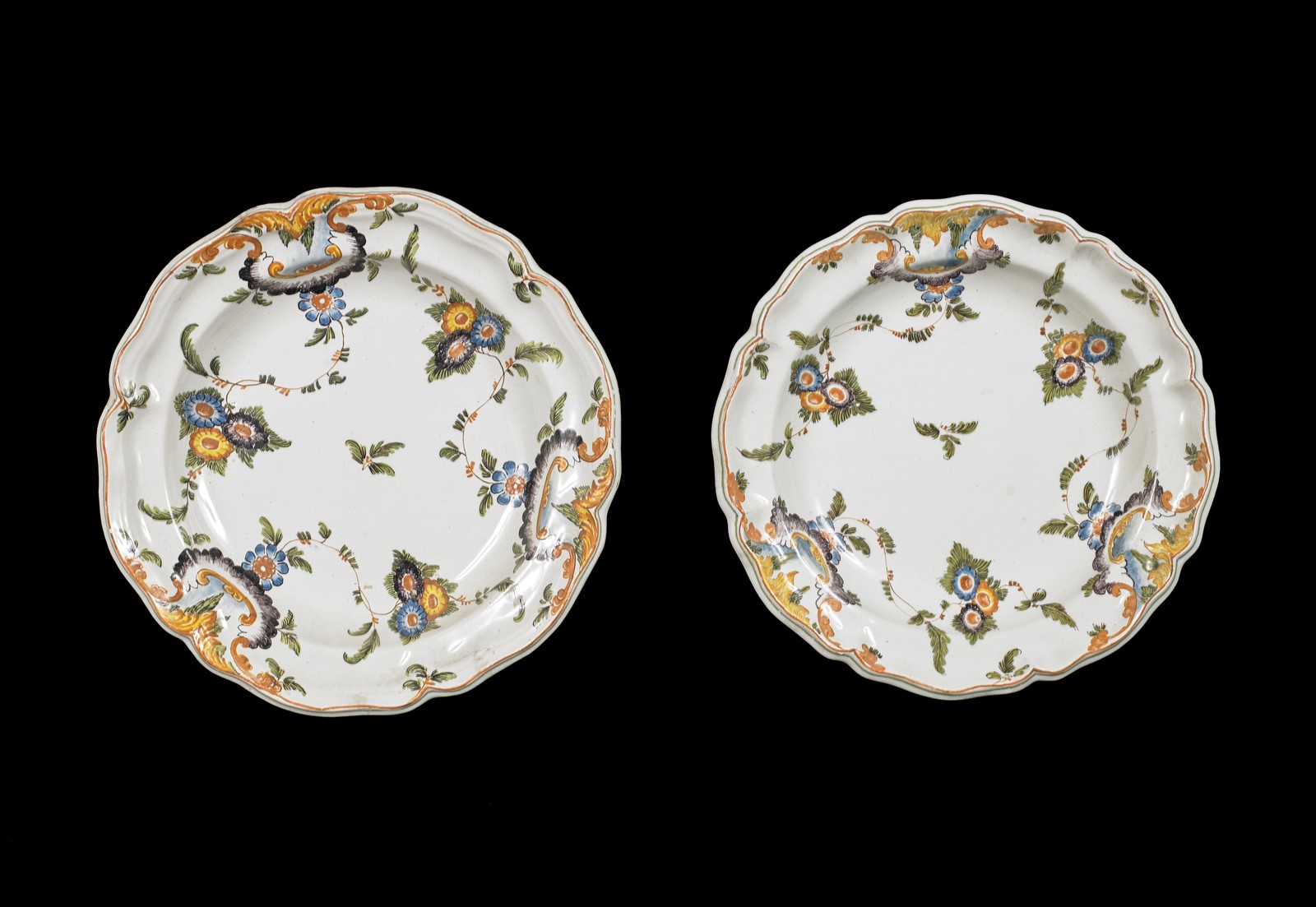 MANIFATTURA VENETA DEL XVIII SECOLO Coppia di piatti in maiolica decorati a motivi floreali. . . Cm 23,50.