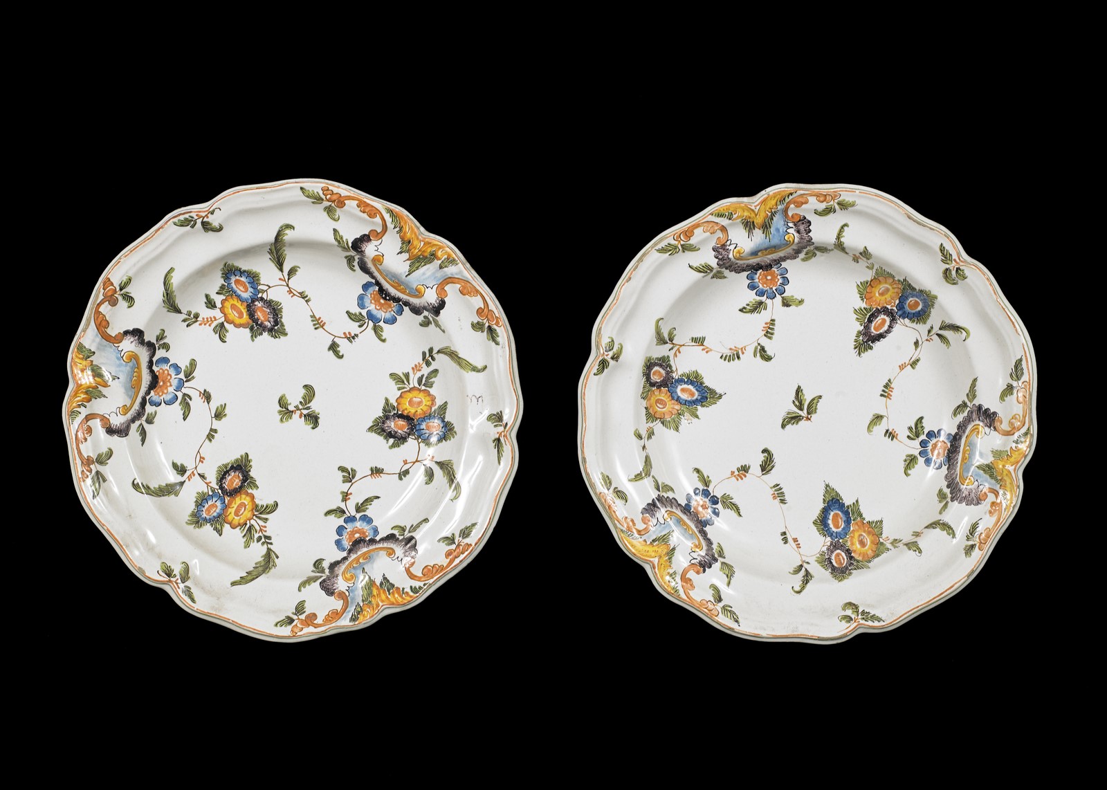 18th CENTURY VENETO MANUFACTURE A pair of majolica plates with flowers motifs. . Cm 23,00.