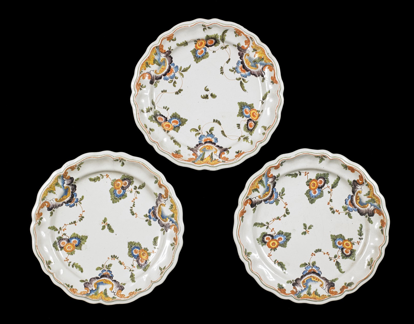 MANIFATTURA VENETA DEL XVIII SECOLO Tre piatti sagomati in ceramica policroma...