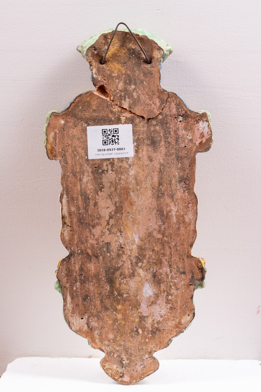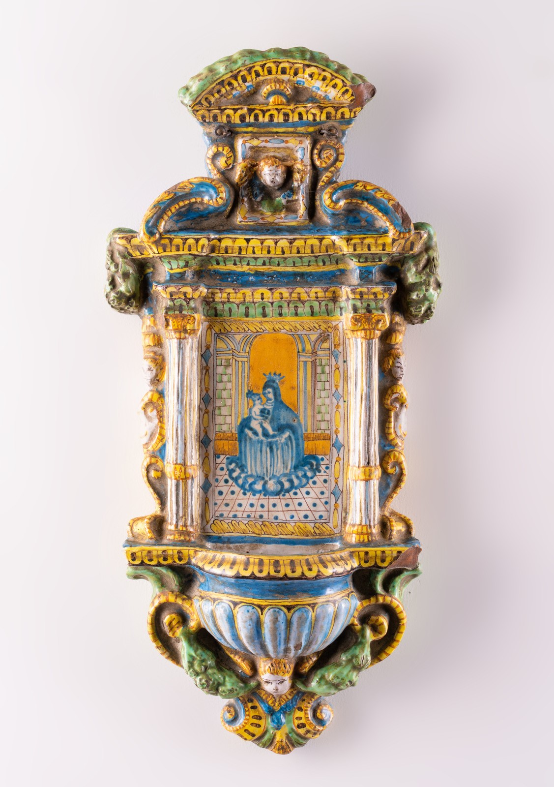 MANIFATTURA ITALIANA DEL XVIII SECOLO Acquasantiera in maiolica dipinta in policromia raffigurante La Madonna con il Bambino. . Cm 21,00 x 41,00. Difetti e rottura nella zona superiore.