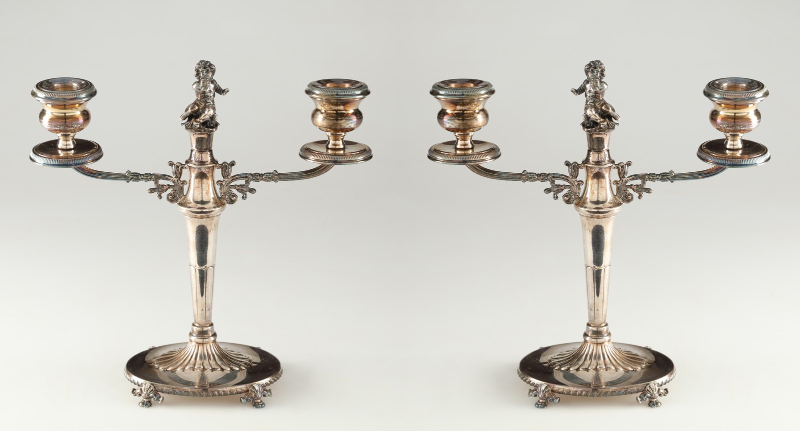 SILVERSMITH 20th CENTURY A pair of candlestick to two flames, central shaft surmounted by winged cherubs. fritware with underglaze and overglaze painted decoration. Cm 25,00 x 28,00. Stamps present. Weight 1290 gr.