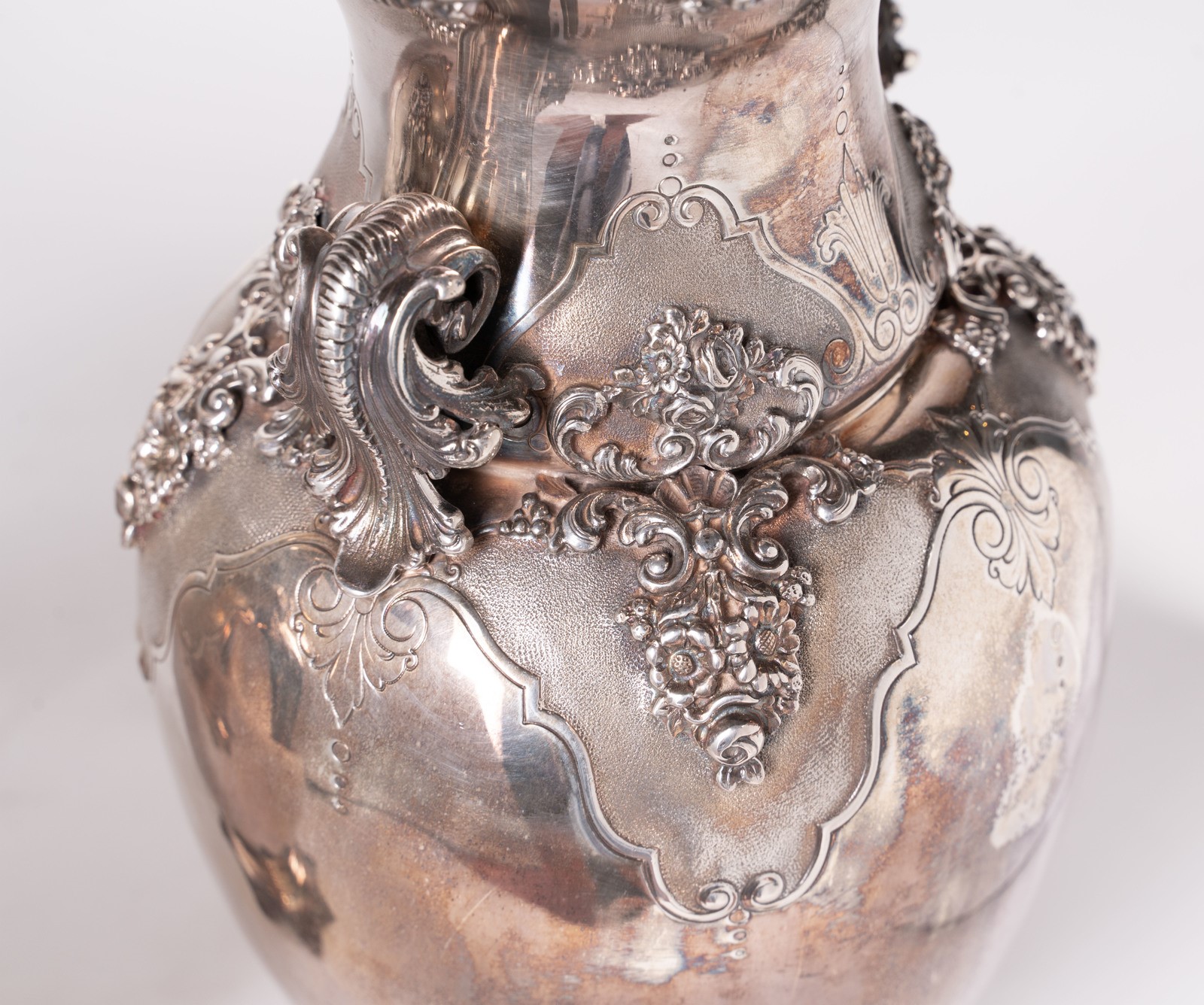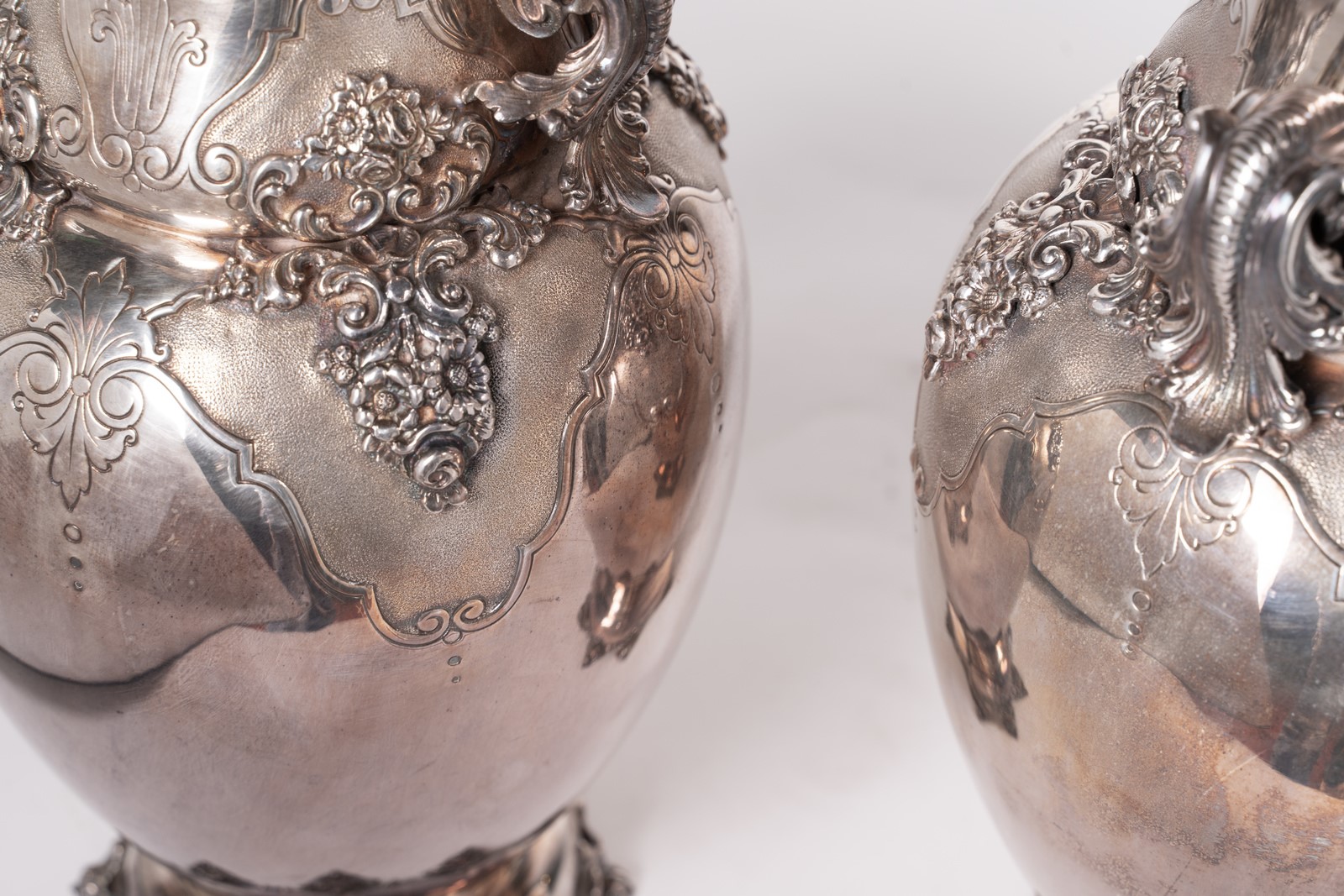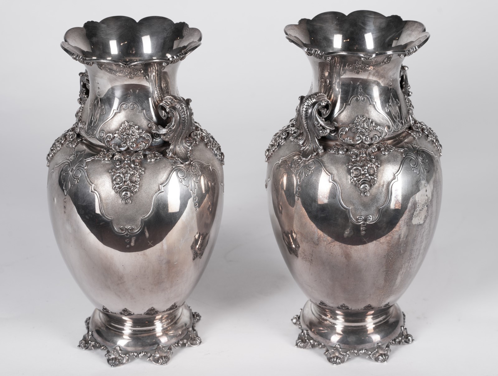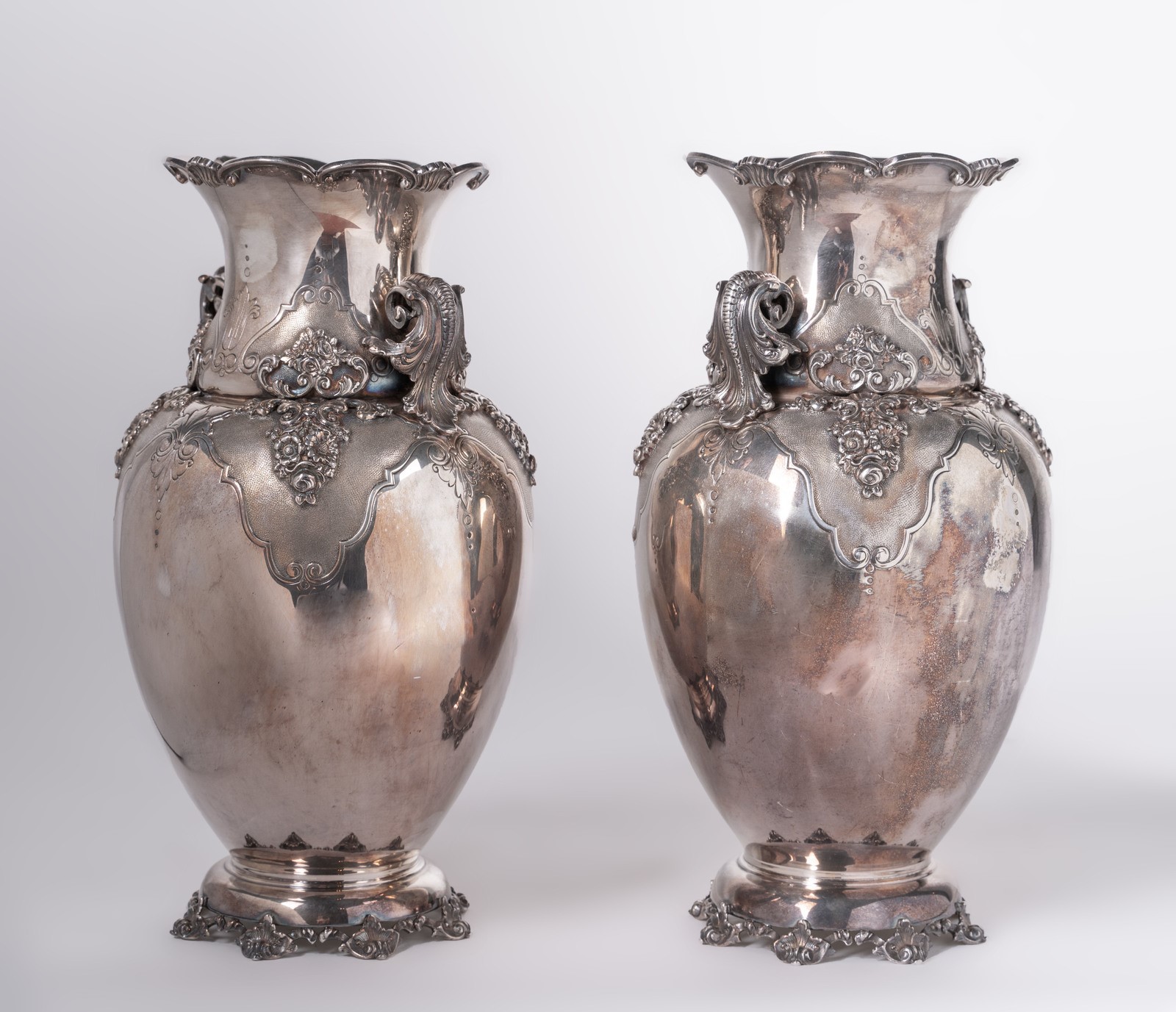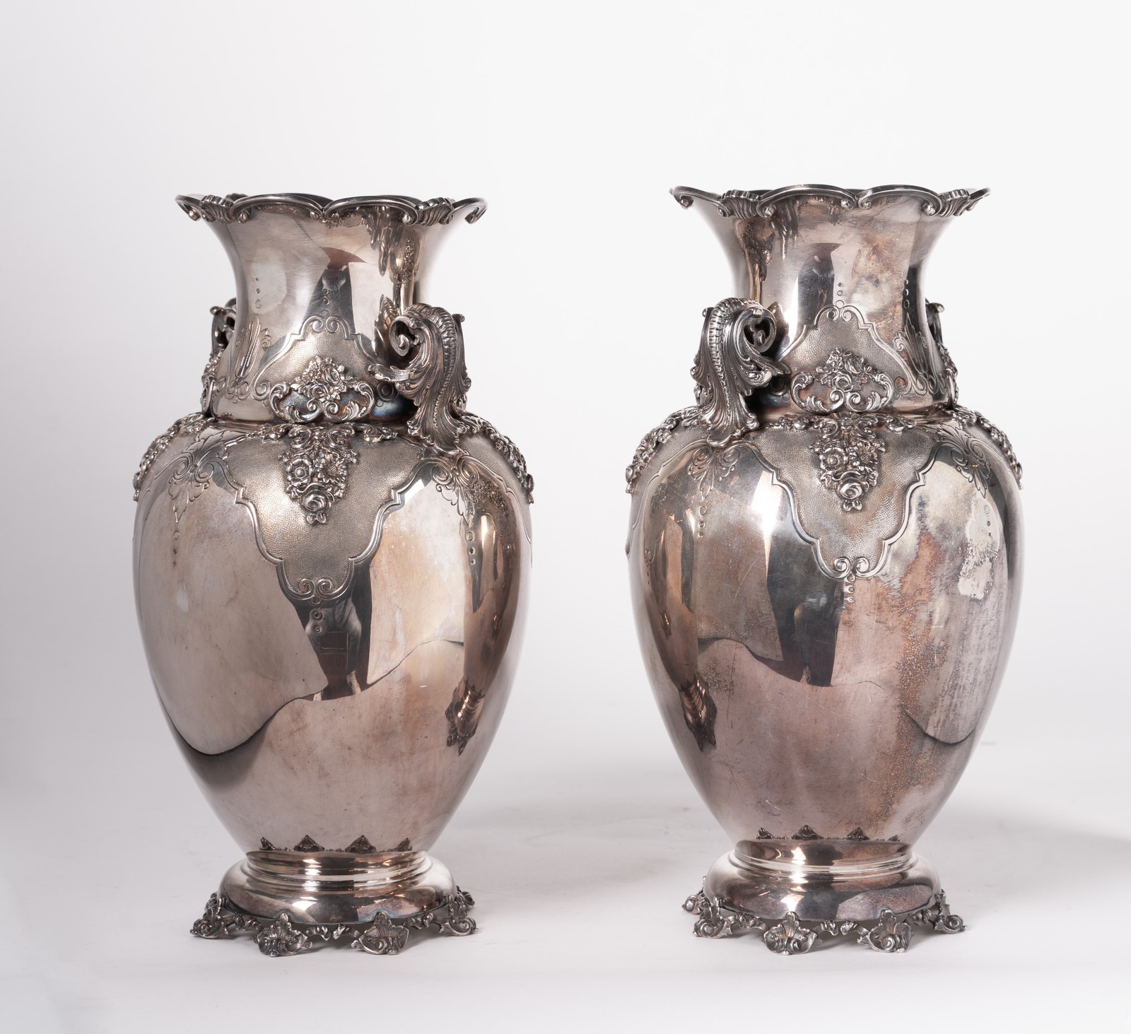 ARGENTIERE ITALIANO DEL XX SECOLO Coppia di vasi in argento sbalzato e cesellato. . Cm 31,00. Peso gr 2448. Presenti punzoni.