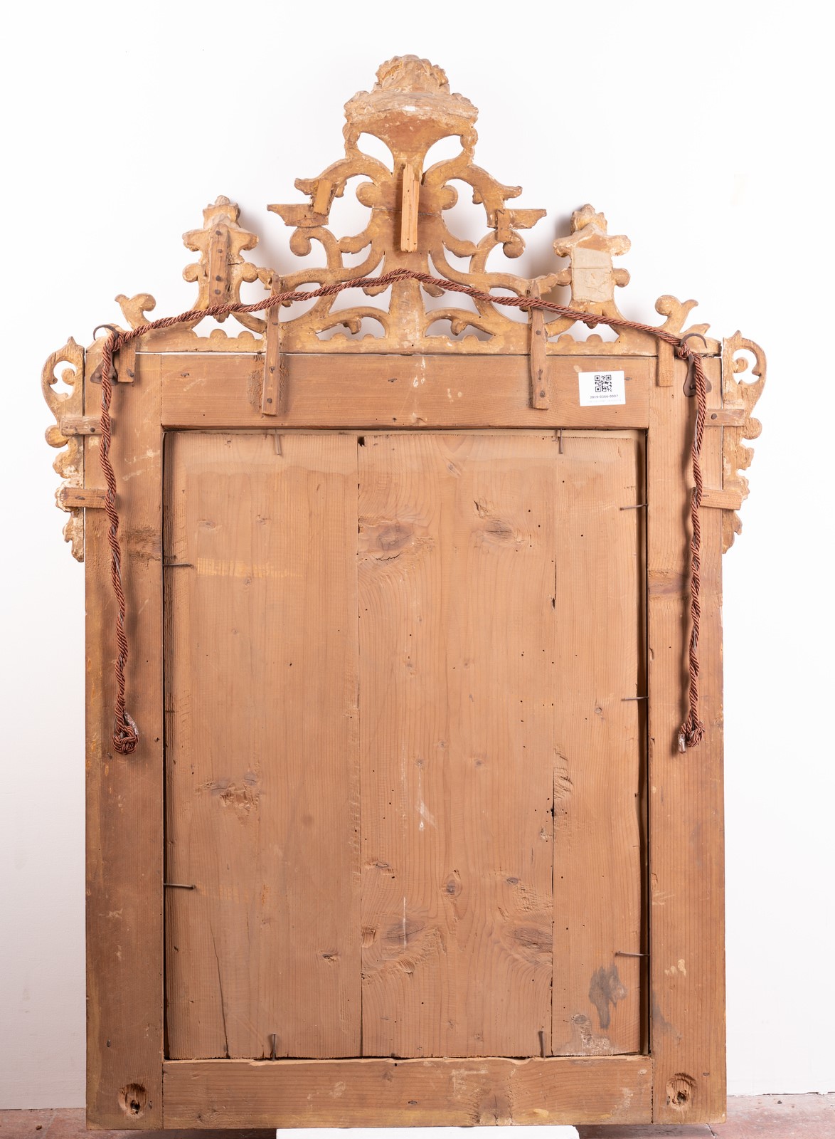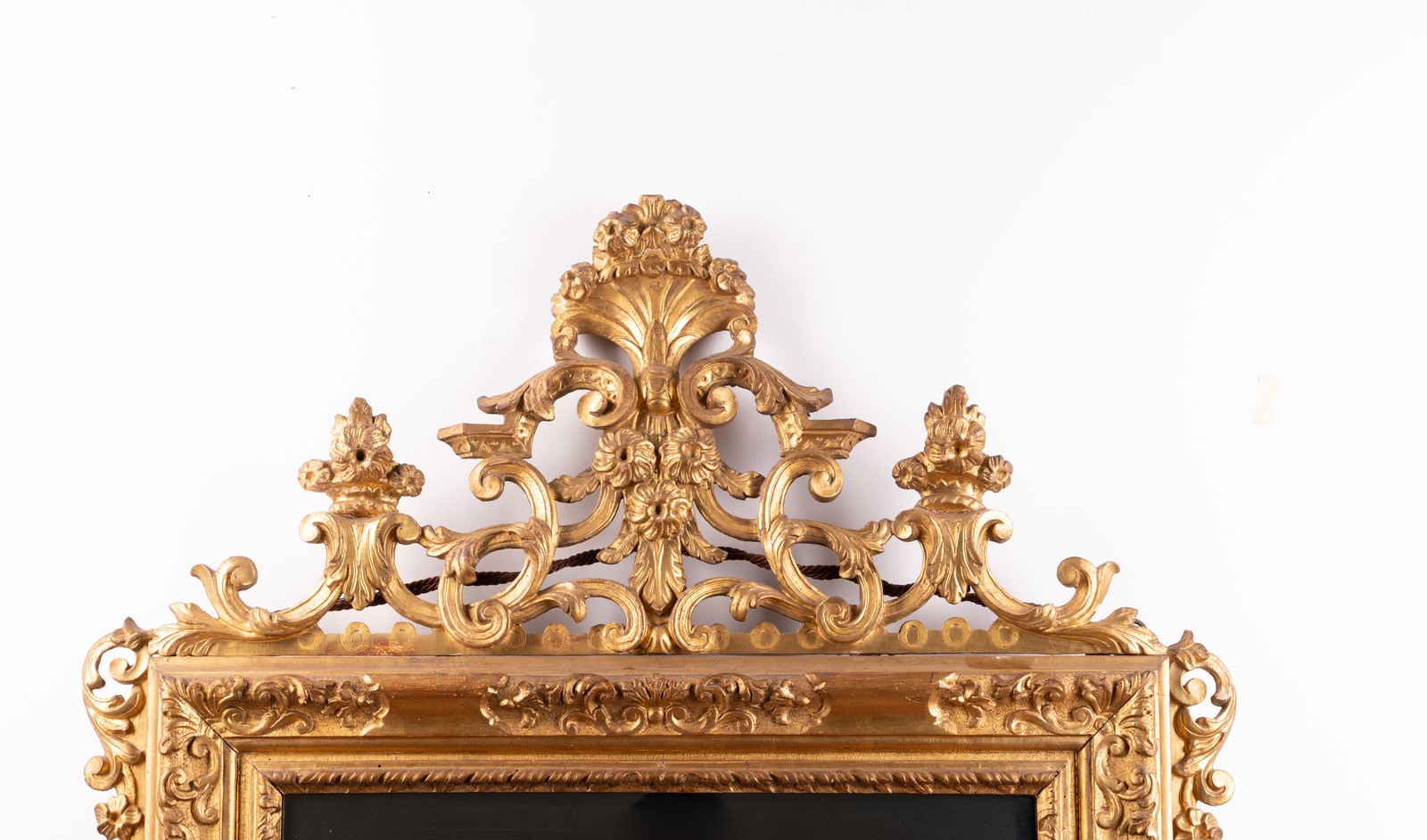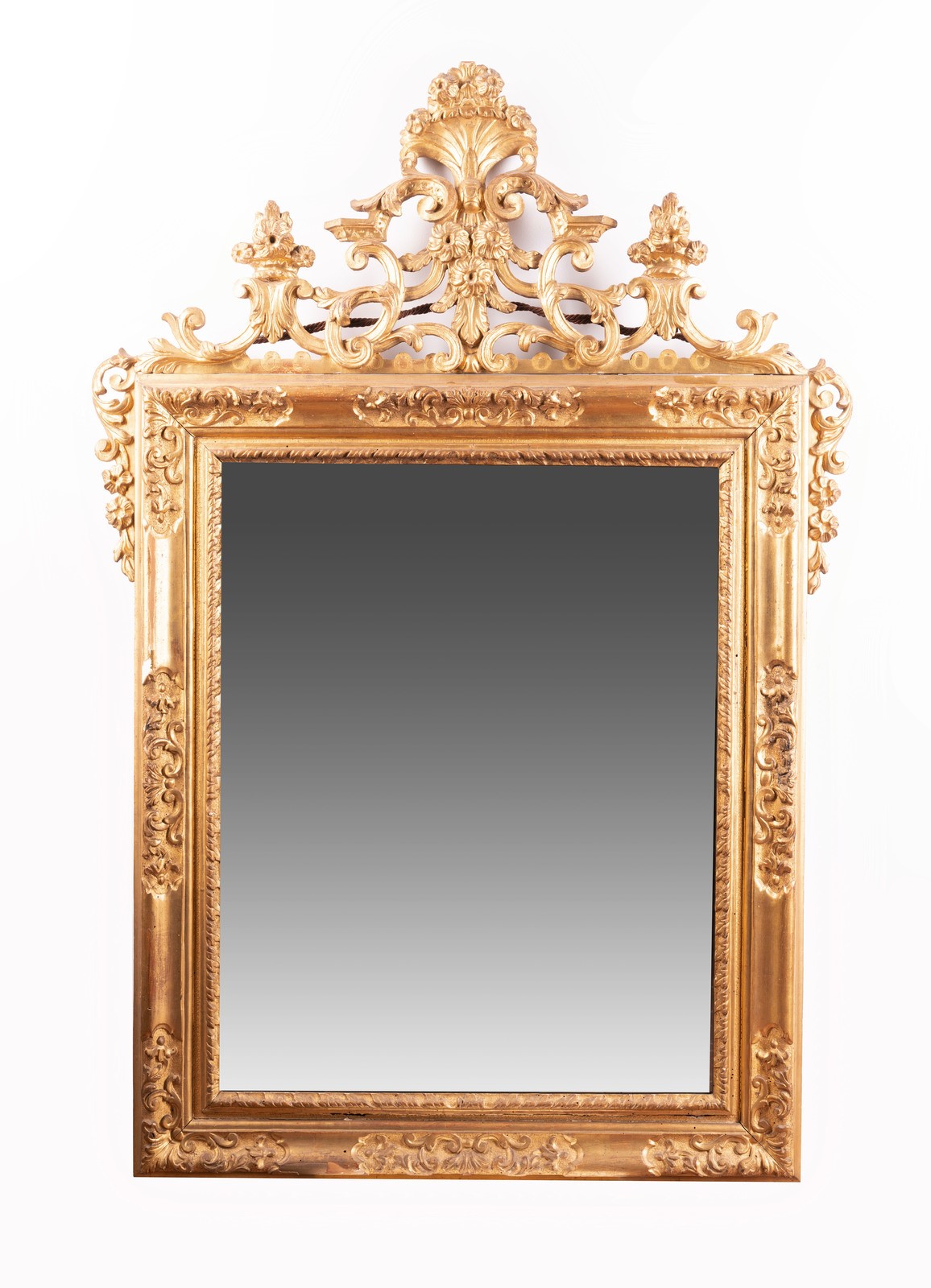 MANIFATTURA DEL XIX SECOLO Specchiera in legno scolpito e dorato con cimasa...