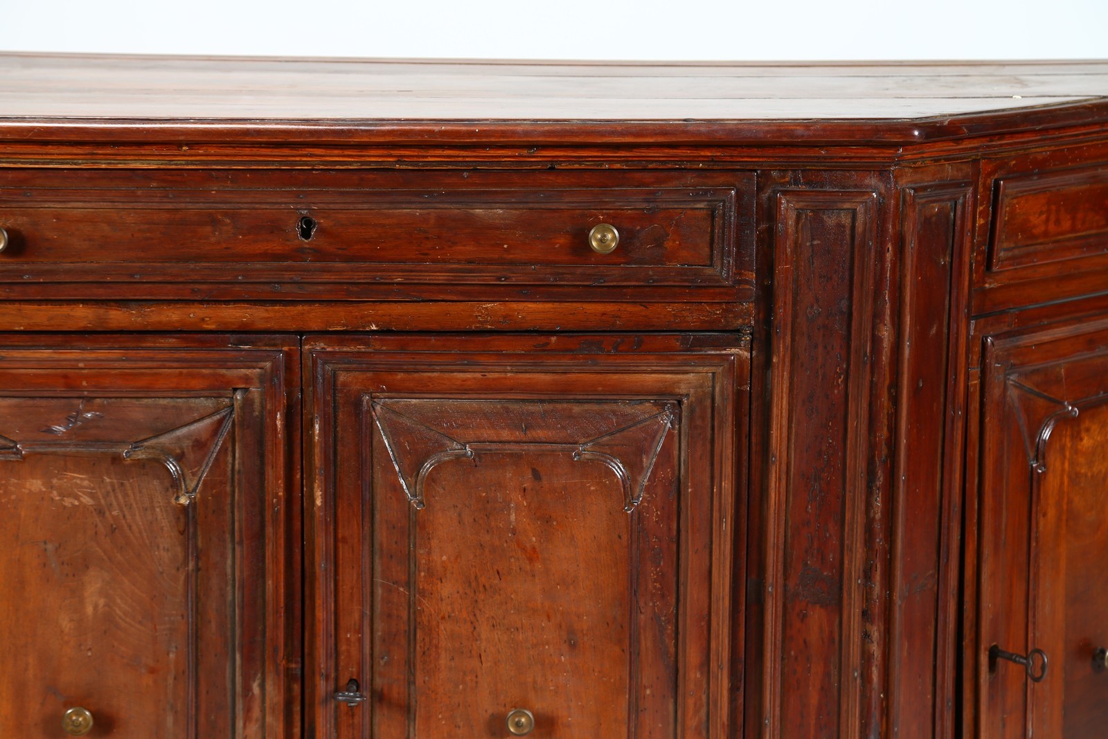MANIFATTURA ITALIANA DEL XVII SECOLO Credenza scantonata in legno di noce. . Cm 186,00 x 104,00 x 50,00. A quattro ante e quattro cassetti. Pomoli dei cassetti in bronzo. Restauri.