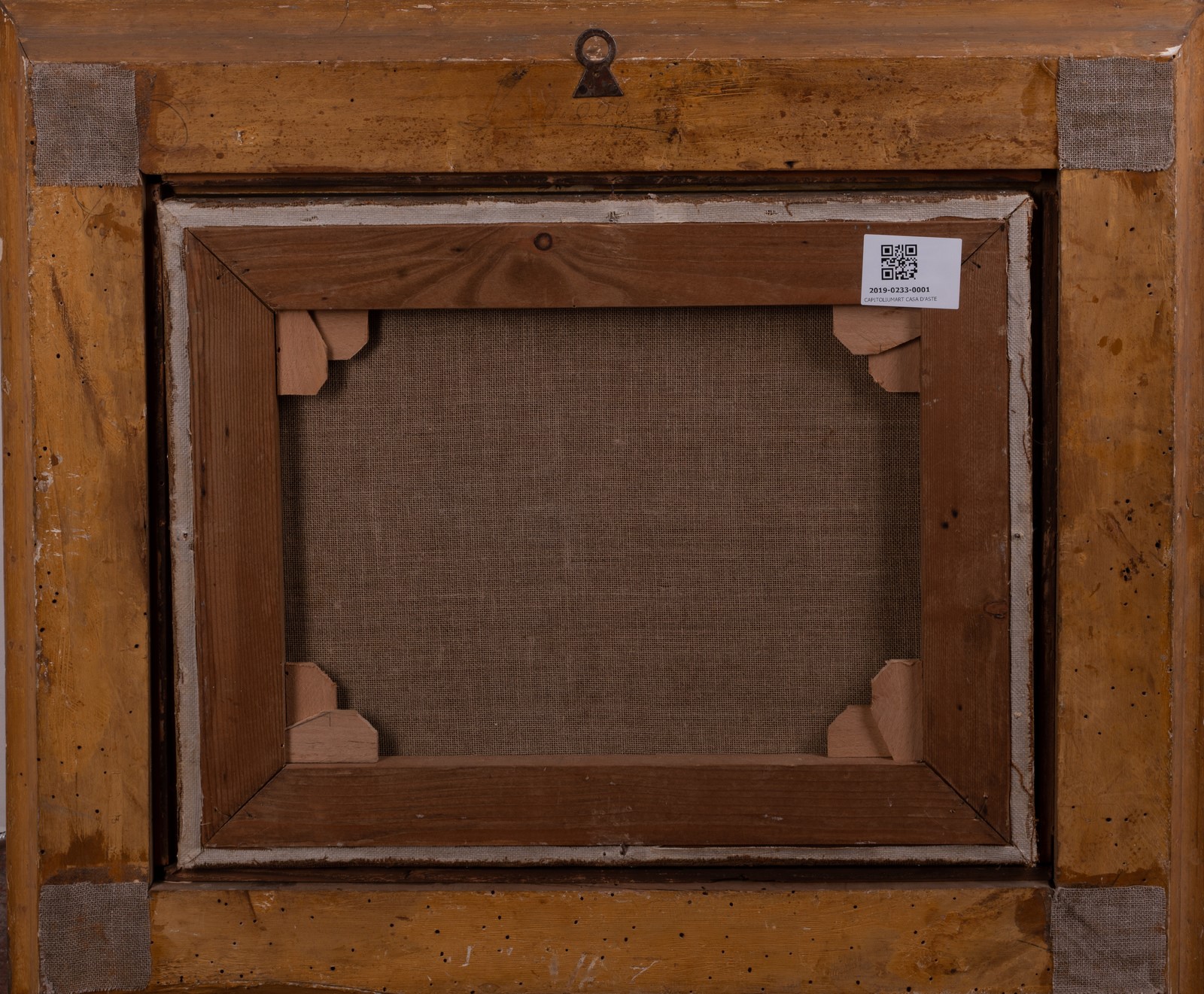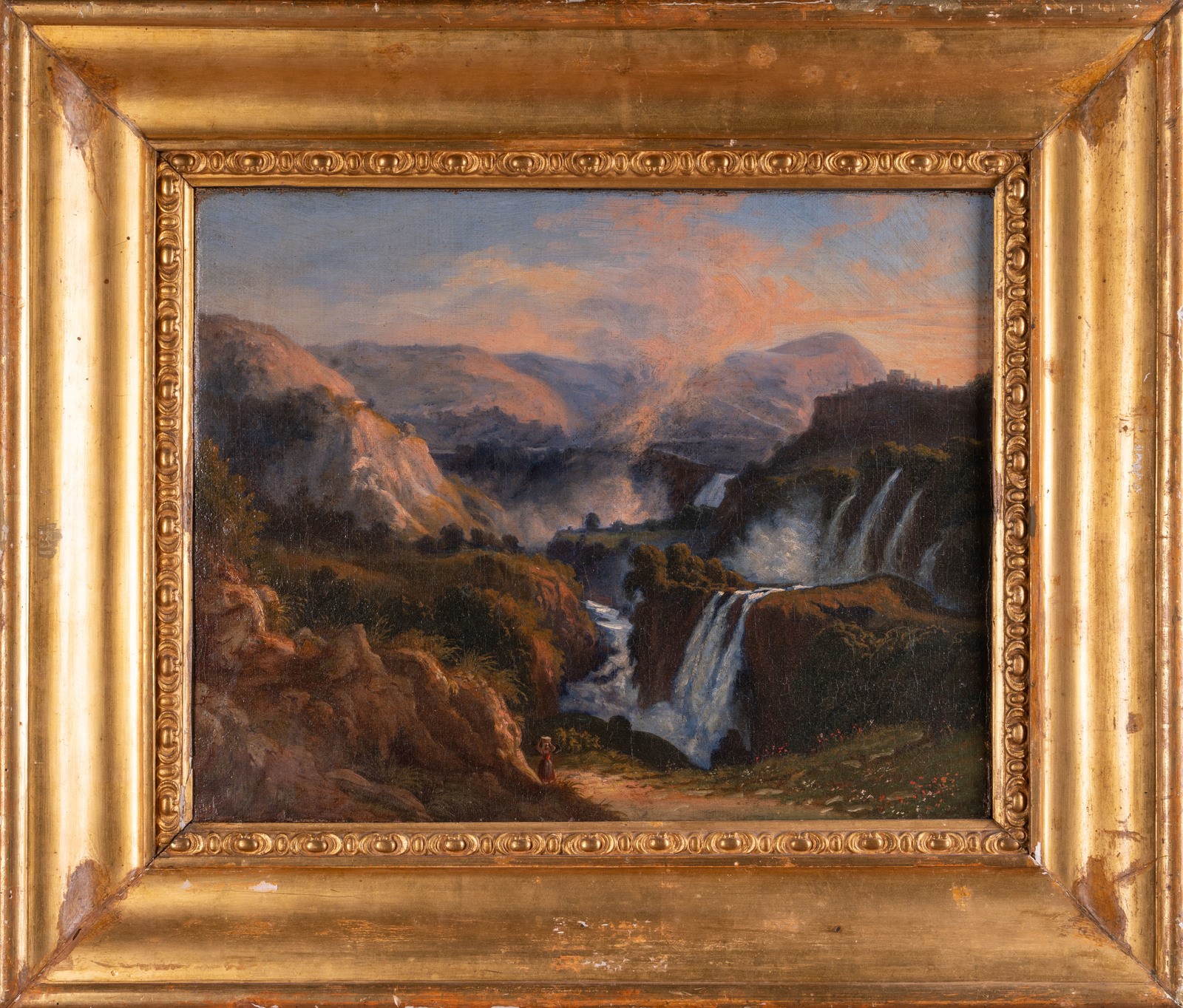 18th CENTURY ARTIST Landscape with falls and wayfarer. Oil on canvas . Cm 47,00 x 37,00. . Cornice presente