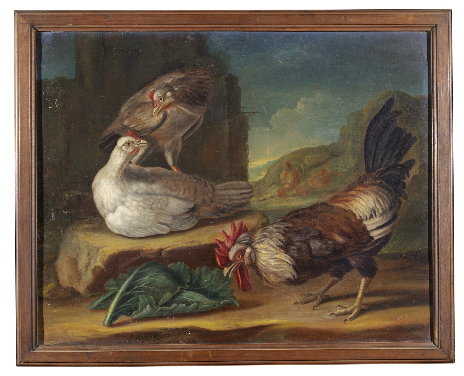 18th CENTURY LOMBARD ARTIST Rooster and chicken in the farmyard. Oil on canvas . Cm 48,00 x 37,50. . Cornice presente