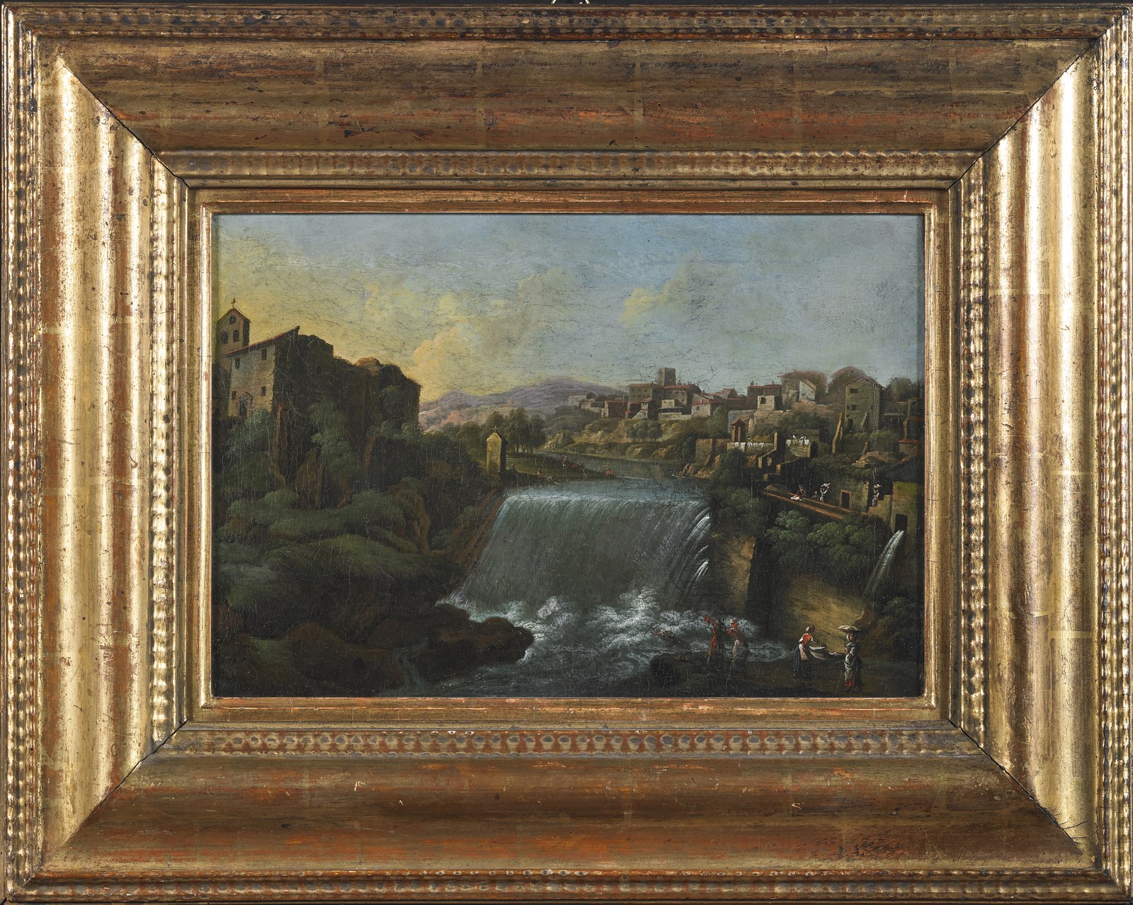ARTISTA ROMANO DEL XVIII SECOLO Tivoli's falls. Oil on canvas . Cm 26,50 x 26,50. Antique frame. Cornice presente