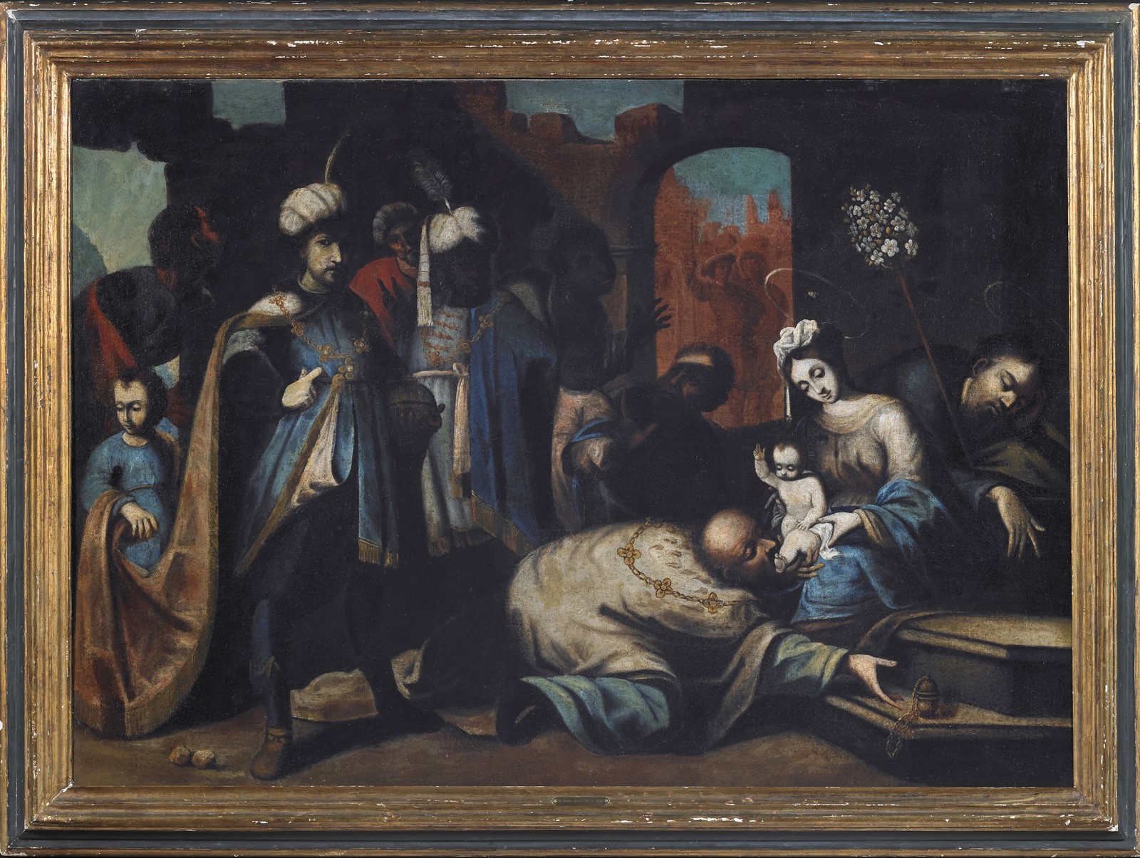 17th CENTURY ARTIST Visit of Re Magi. Oil on canvas . Cm 114,50 x 80,00. . Cornice presente