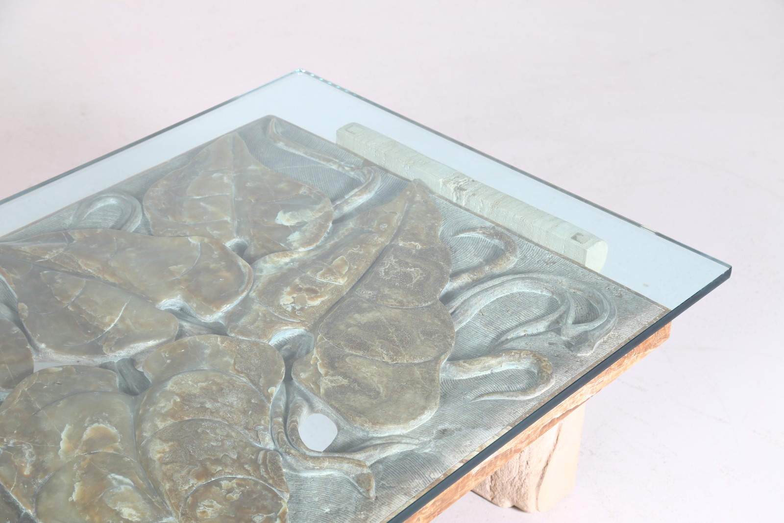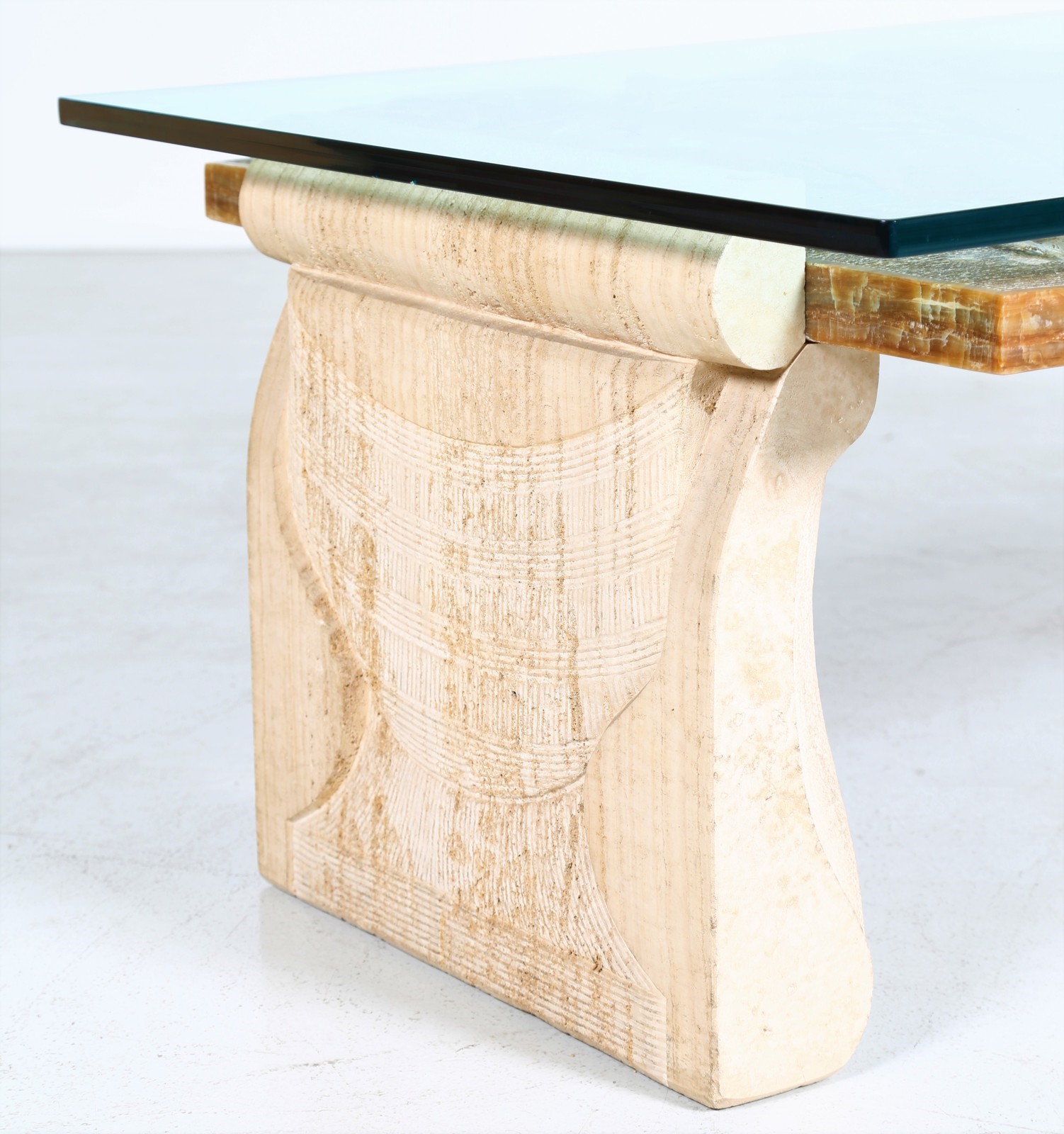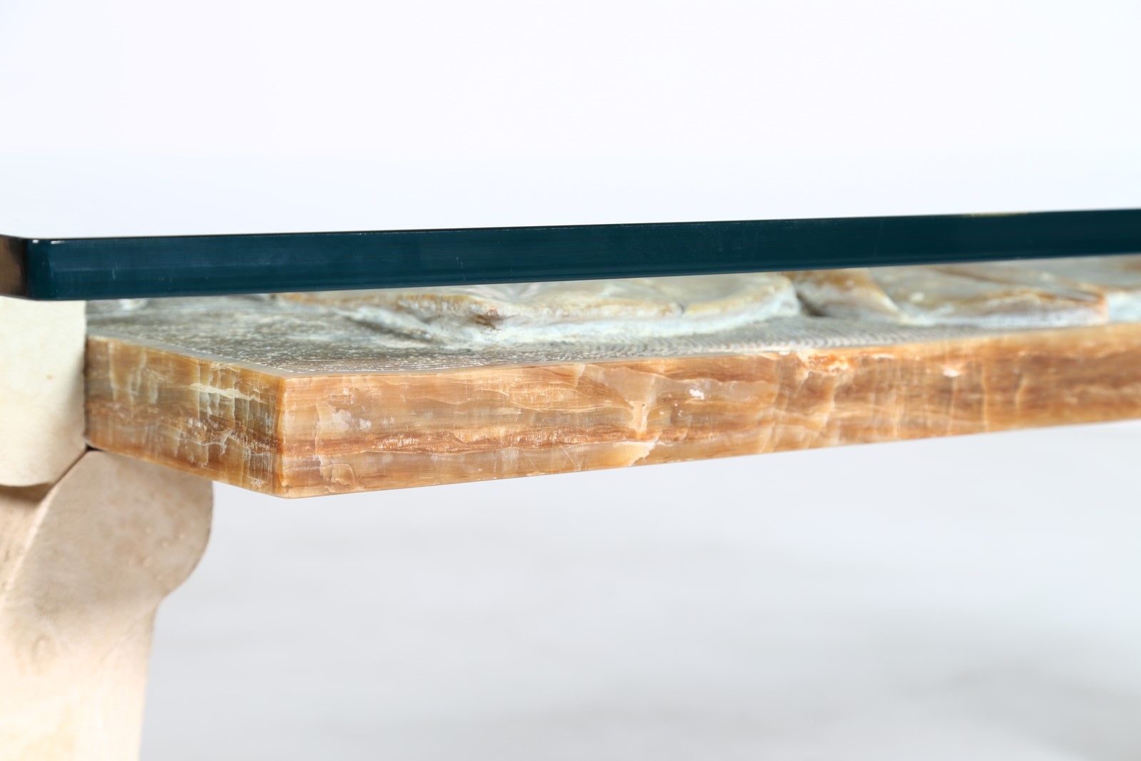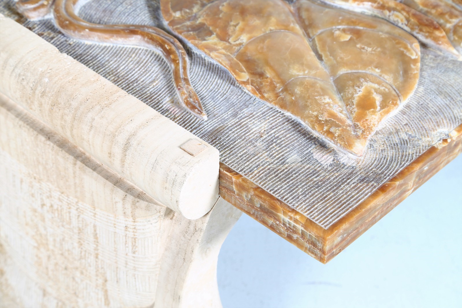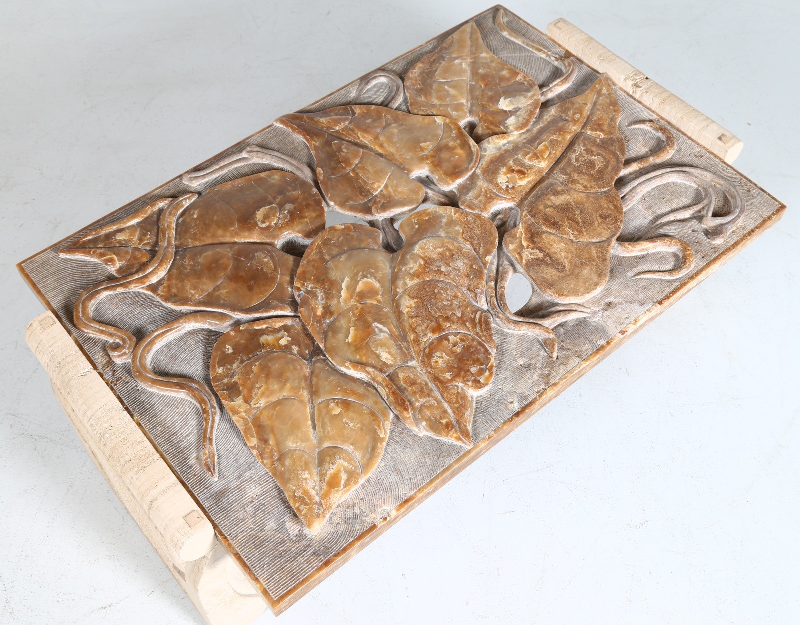 MANIFATTURA ITALIANA Tavolino in alabastro scolpito a motivi floreali. . Cm 131,00 x 51,00 x 80,00.