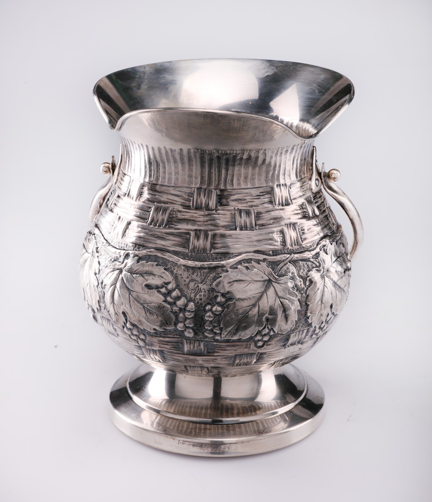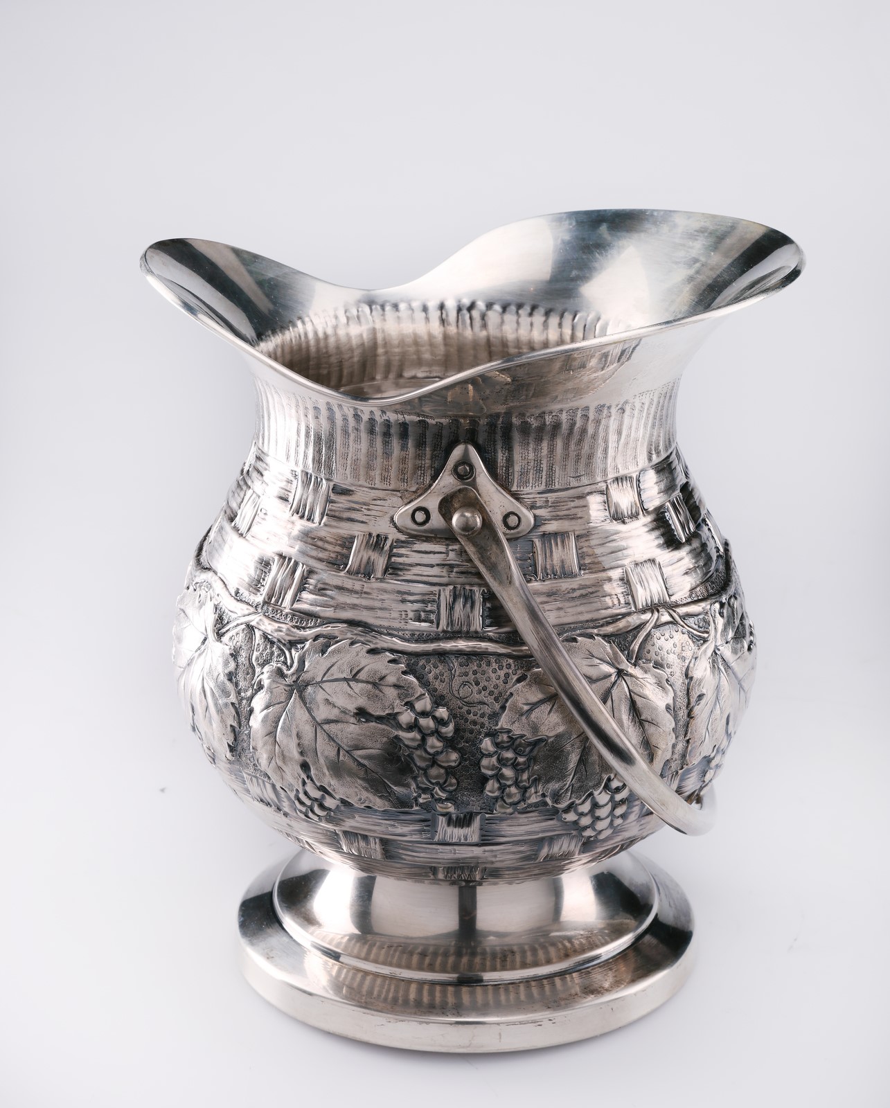 ARGENTIERE ITALIANO DEL XX SECOLO Large silver ice bucket with circular base, stem embossed with vegetable motifs, chiselled handle. . Cm 29,00. Weight 1600 gr. Stamps present.