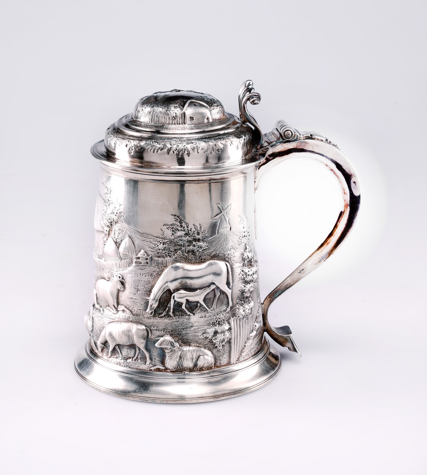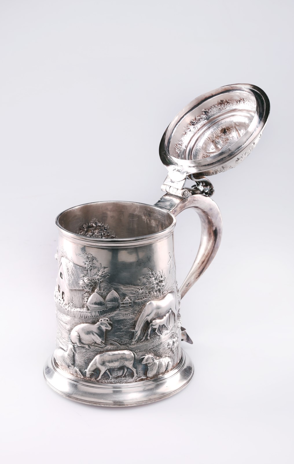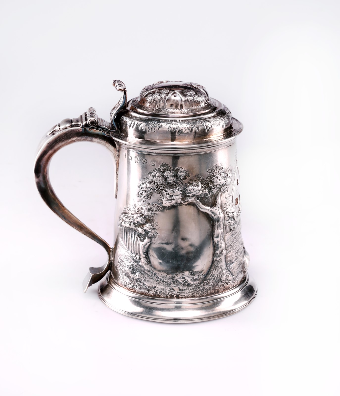 MANIFATTURA INGLESE DEL XVIII SECOLO George III silver tankard, Newcastle. . Cm 17,00 x 21,00. These words are engraved: Thomas S, New Bond Street. Weight 984 g. Stamps present.