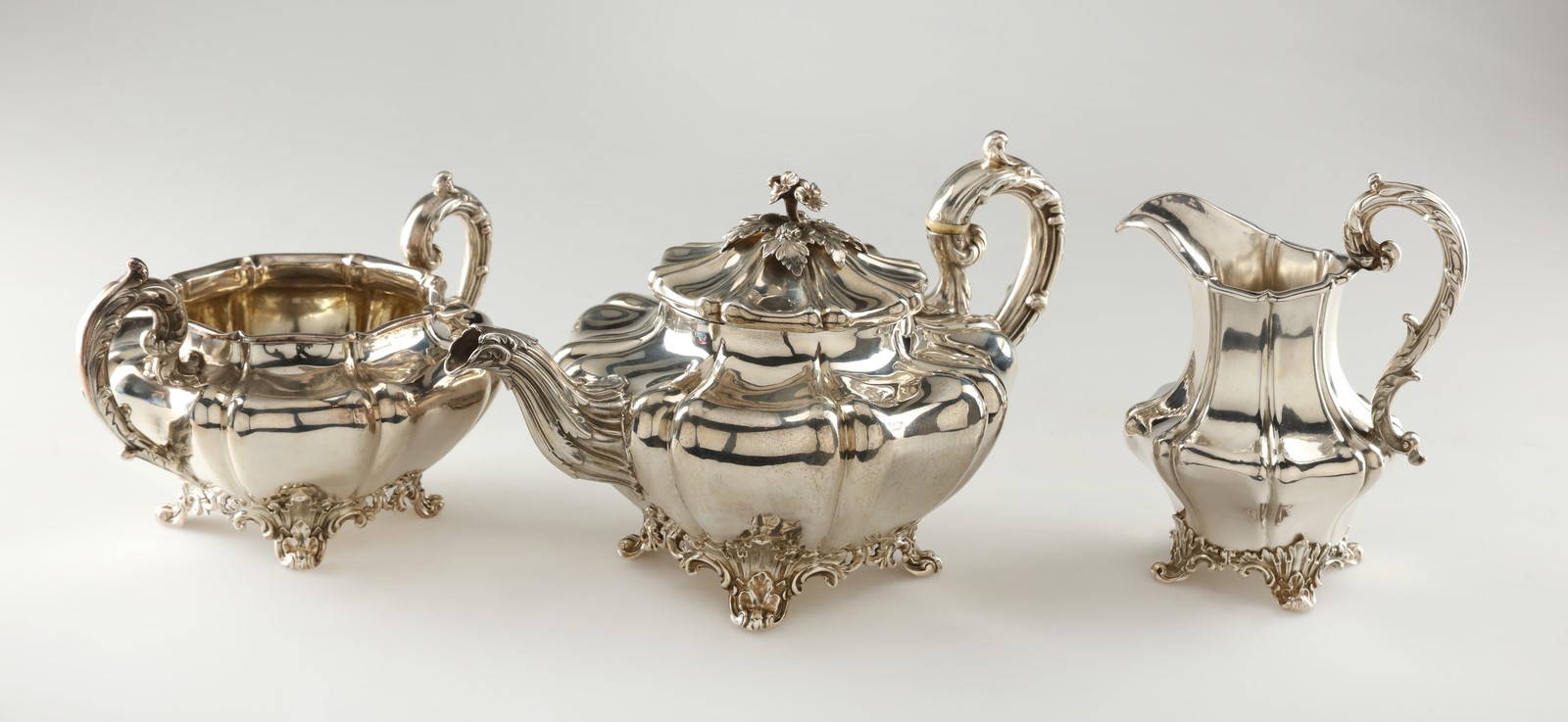 ARGENTIERE INGLESE DEL XIX SECOLO Teiera, lattiera e zuccheriera sbalzate a...