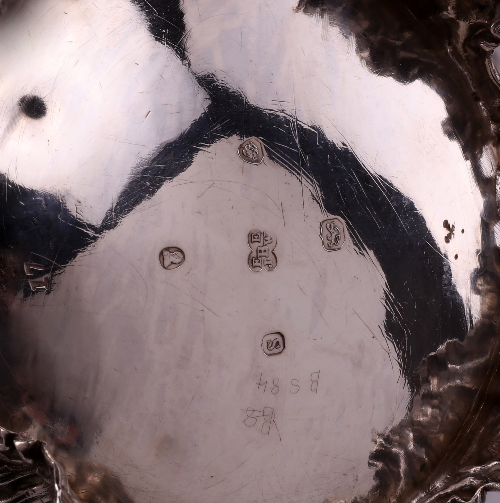 ARGENTIERE INGLESE DEL XIX SECOLO Teiera, lattiera e zuccheriera sbalzate a volute. . Cm 27,00 x 14,50. Punzone alla base della teiera Edward, Edward Jnr, John and W. Barnard, gr. 700 h 14,5x27 cm; zuccheriera gr 408, 12x20 cm; lattiera gr 300, altezza cm 16.5x15.