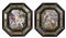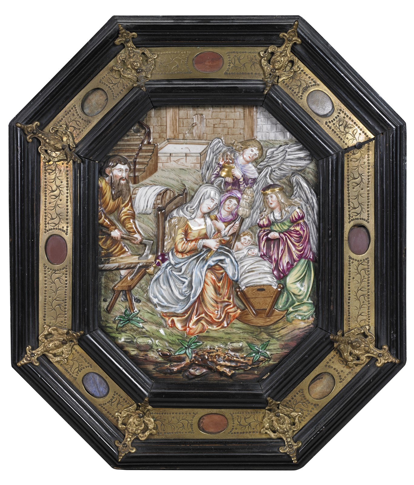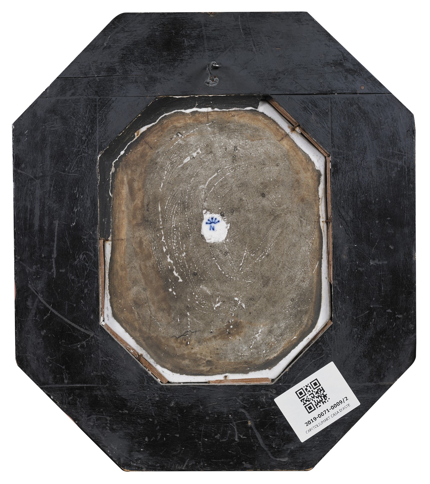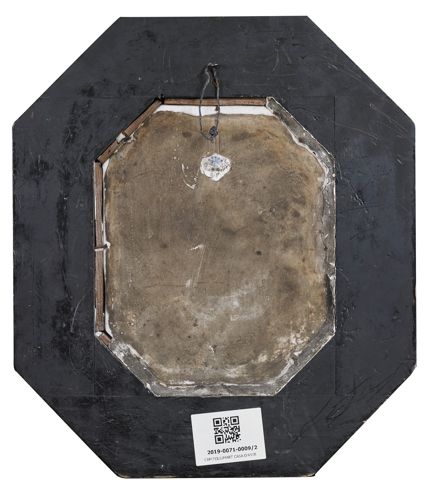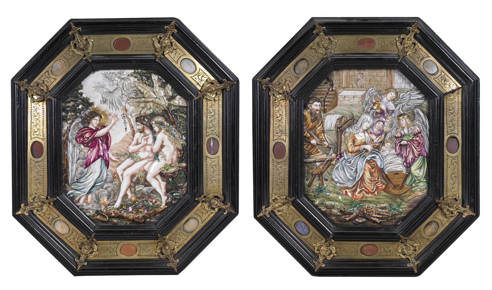 ITALY 19TH CENTURY A pair of frames in wood ebanizzato, octagonals. fritware with underglaze and overglaze painted decoration. Cm 30,00 x 34,00. With embossed copper decorations and semiprecious stones with two porcelain plates by Capodimonte depicting "the expulsion from Paradise" and "Holy Family and angels". Light 21x17cm. Plate size 21x17cm.. Cornice presente