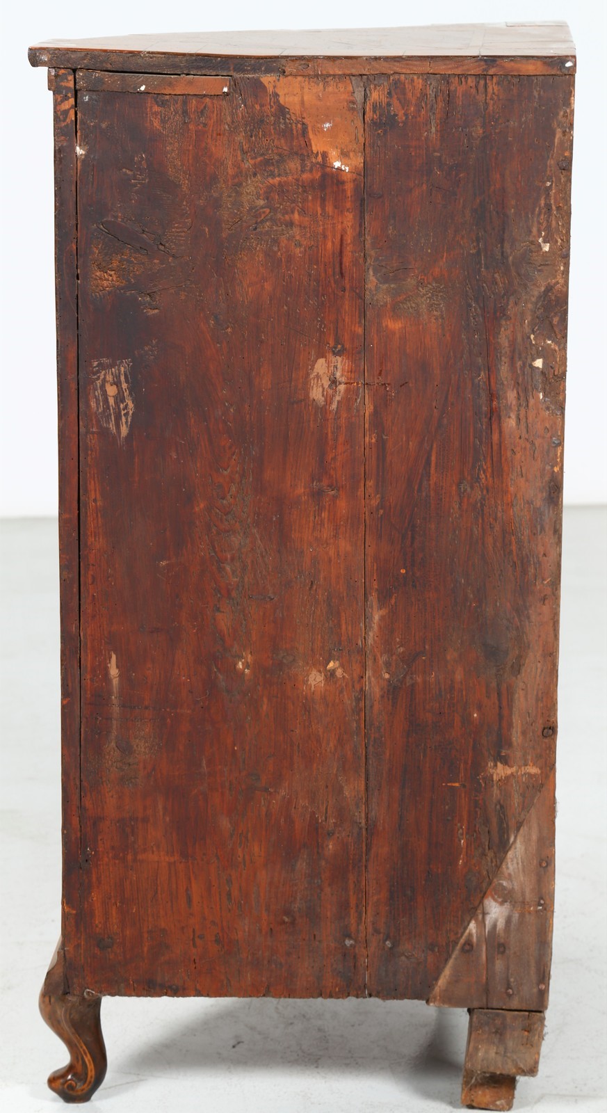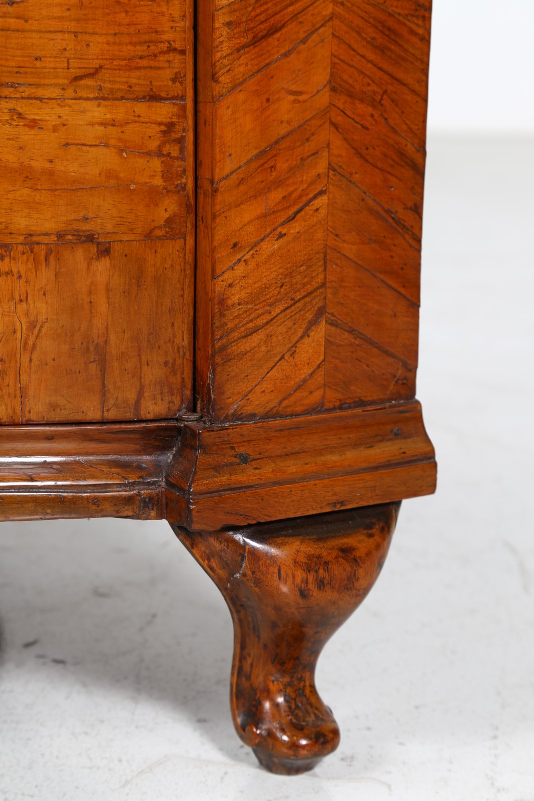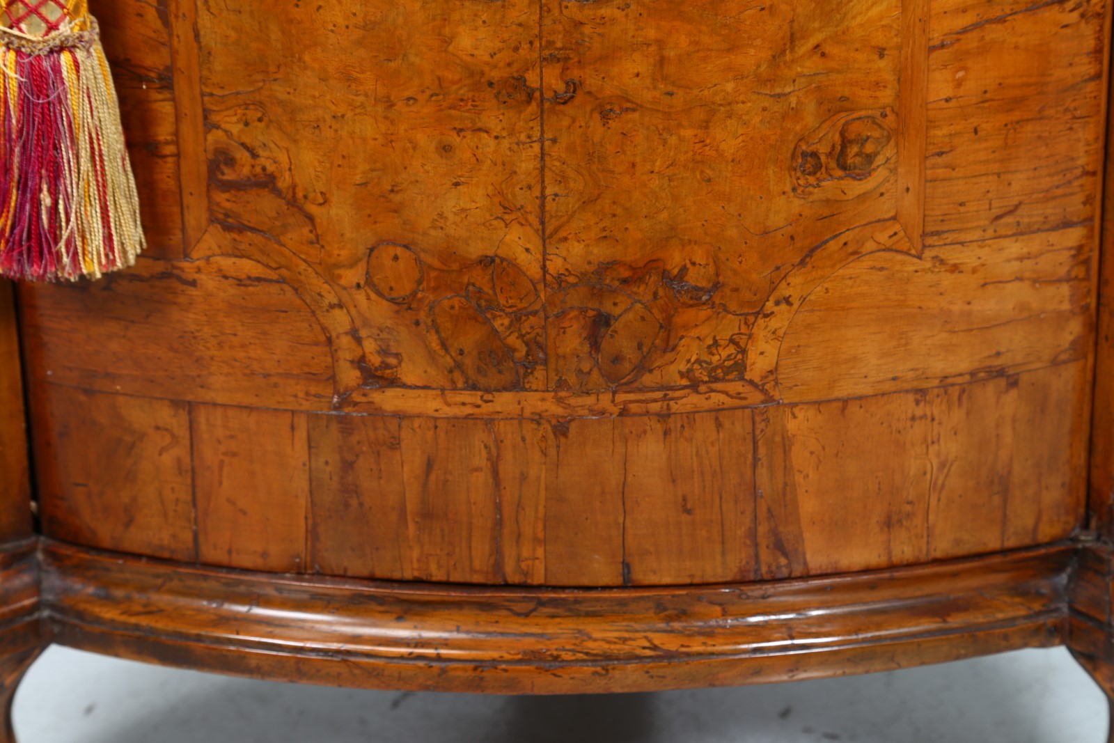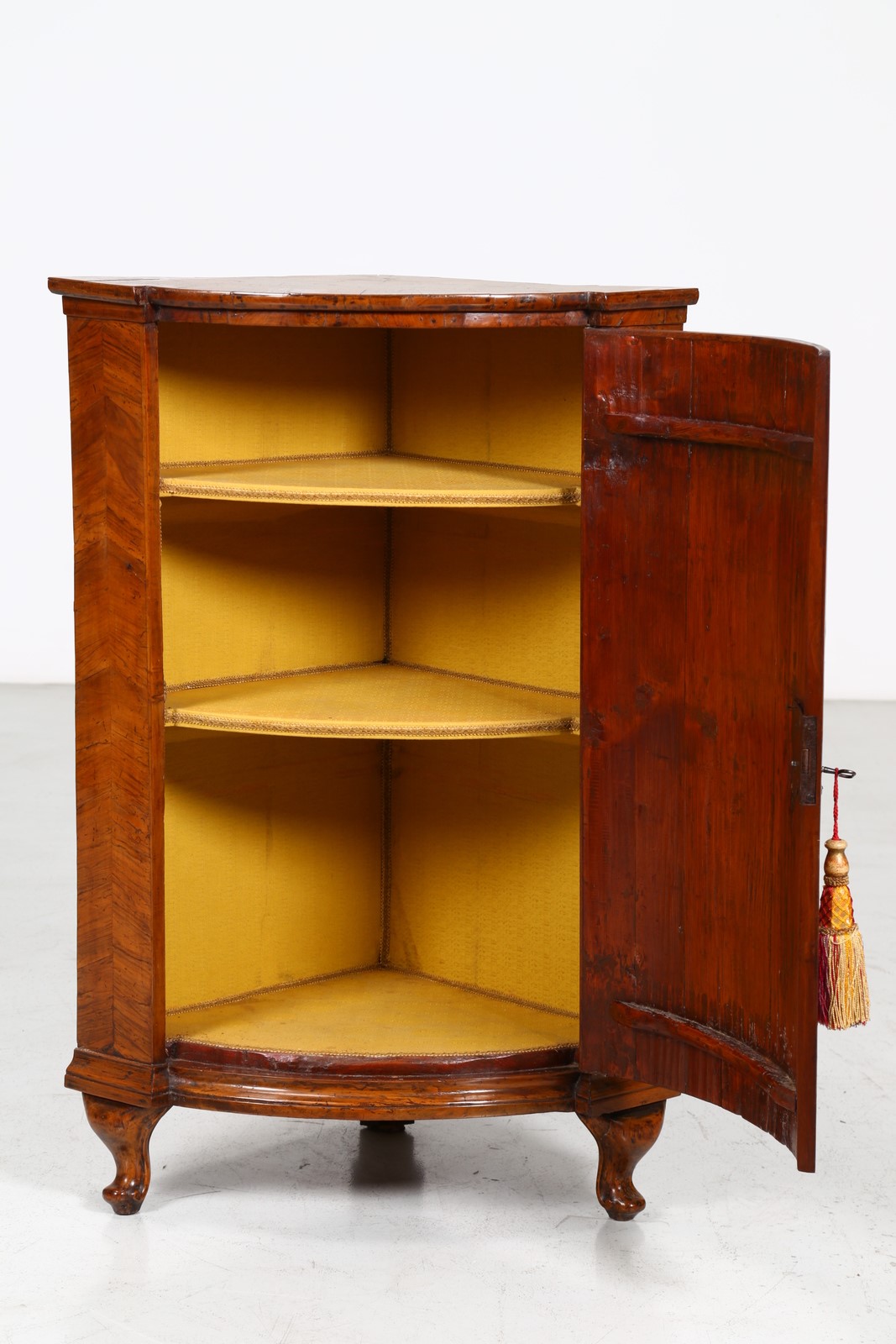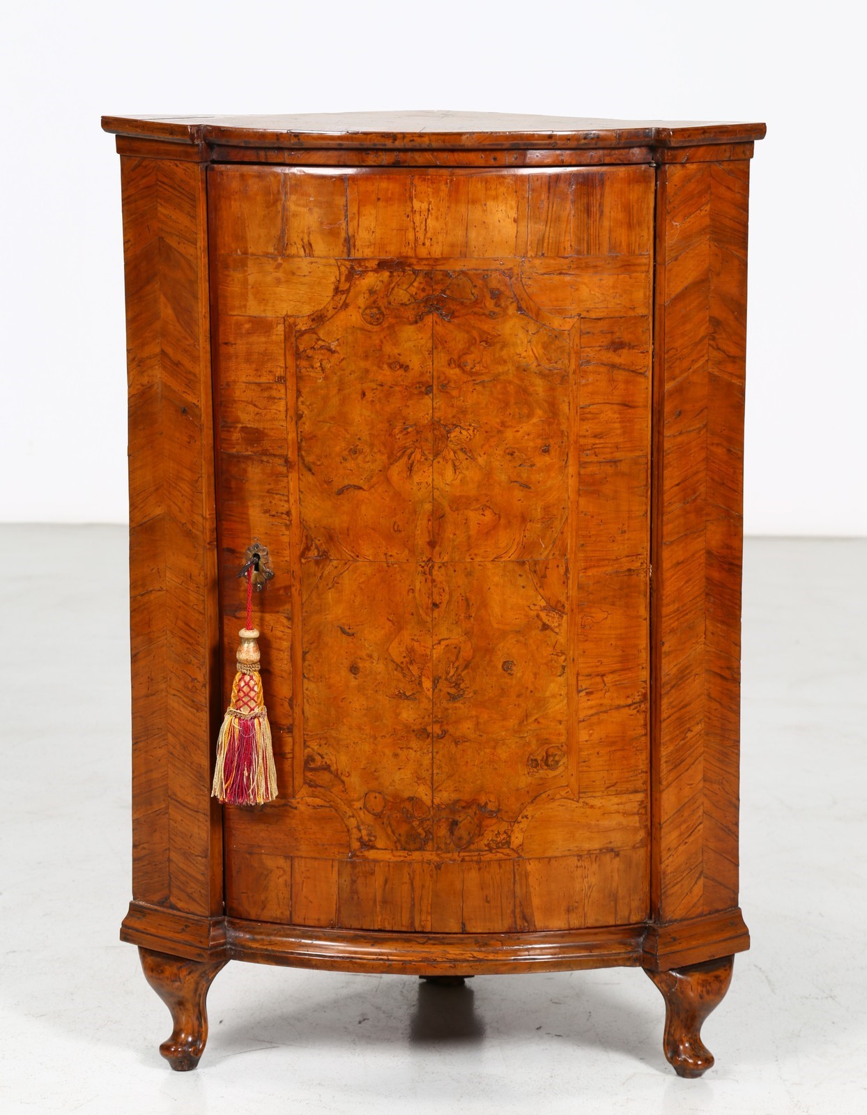 MANIFATTURA VENETA DEL XVIII SECOLO Angoliera in radica di noce a uno sportello, interno con tre ripiani, gambe mosse. . Cm 54,00 x 112,00 x 77,00. Ottimo stato di conservazione.