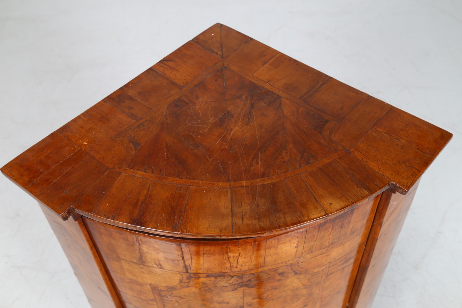 18th CENTURY VENETO MANUFACTURE Walnut corner furniture to a one door, interior with three shelfs, . . Cm 54,00 x 112,00 x 77,00. Excellent conditions.