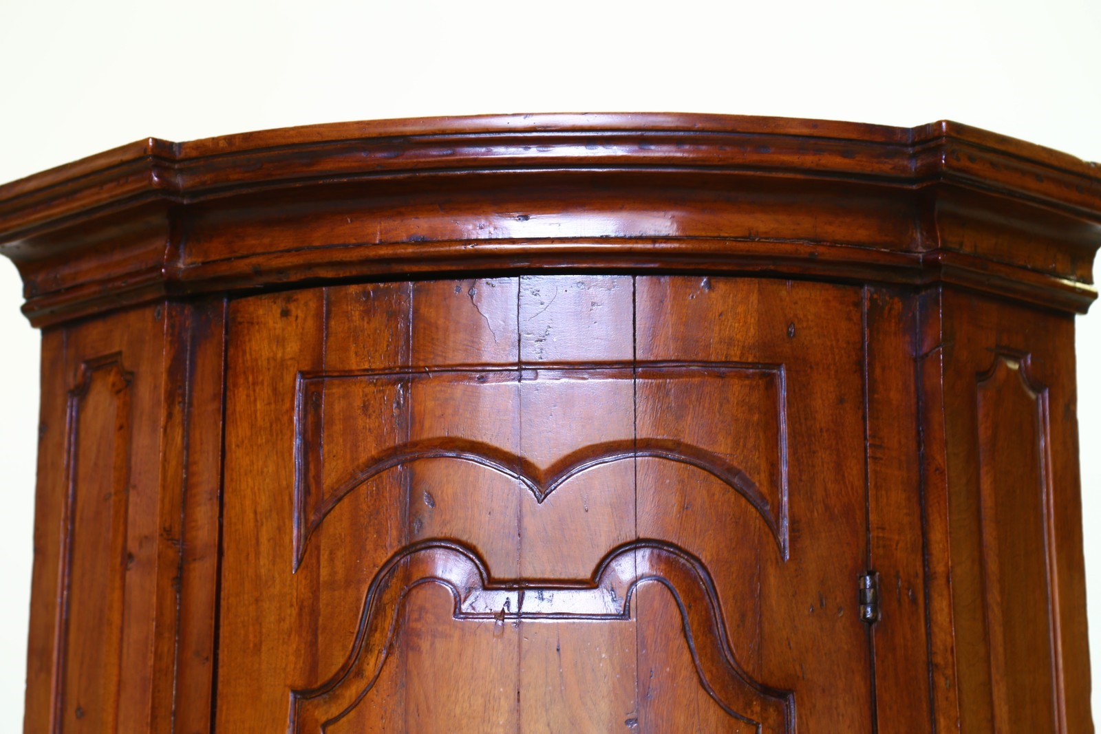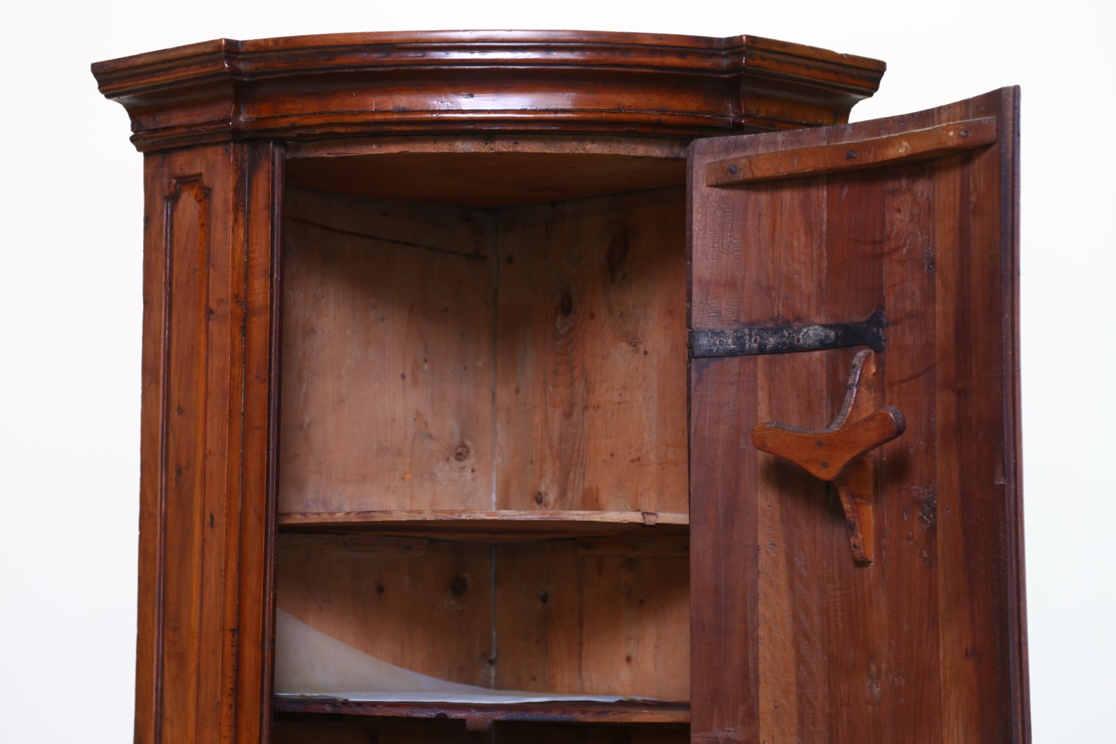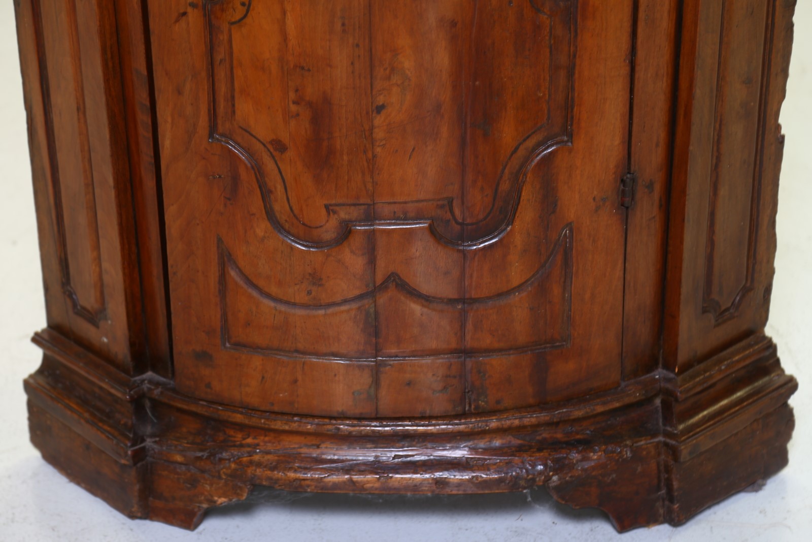 18th CENTURY VENETO MANUFACTURE Walnut corner furniture with a carved shutter. . Cm 204,00. Excellent condition.
