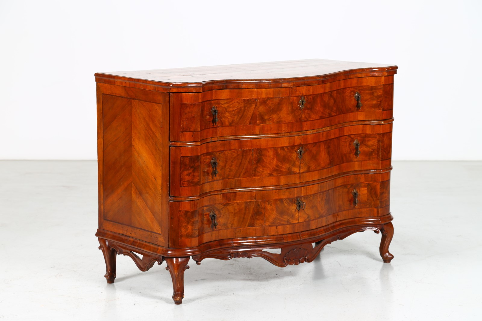 MANIFATTURA VENEZIANA DEL XVIII SECOLO Cassettone in noce e radica di noce a tre cassetti mossi sul fronte, gambe mosse terminanti a ricciolo, grembiale scolpito a volute e conchiglia centrale. . Cm 129,00 x 91,00 x 63,00. Ottimo stato di conservazione.