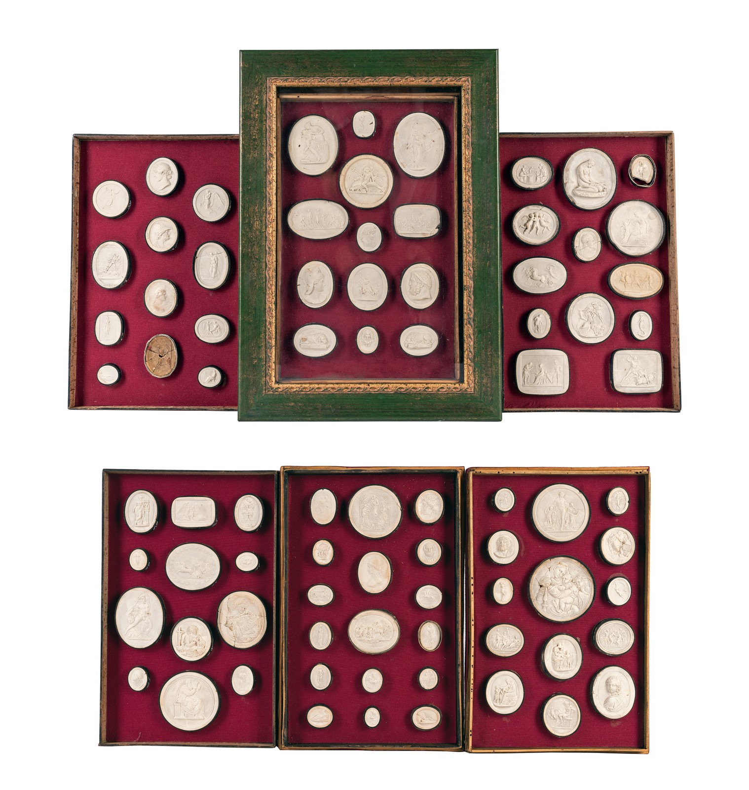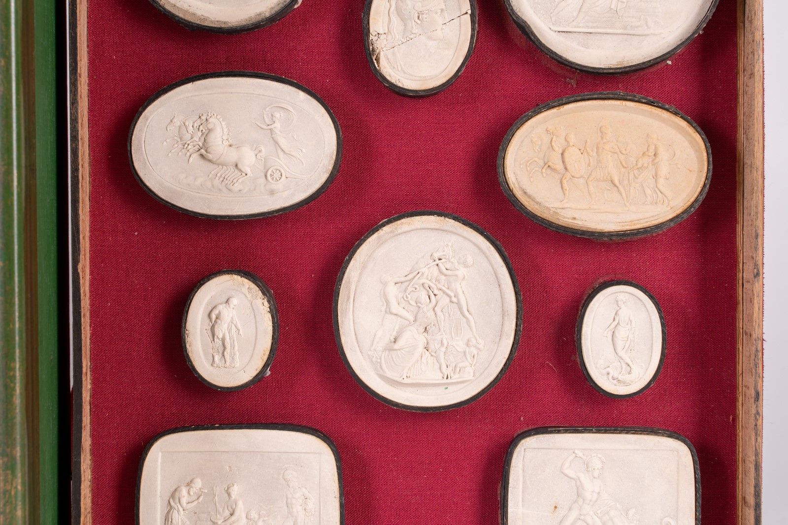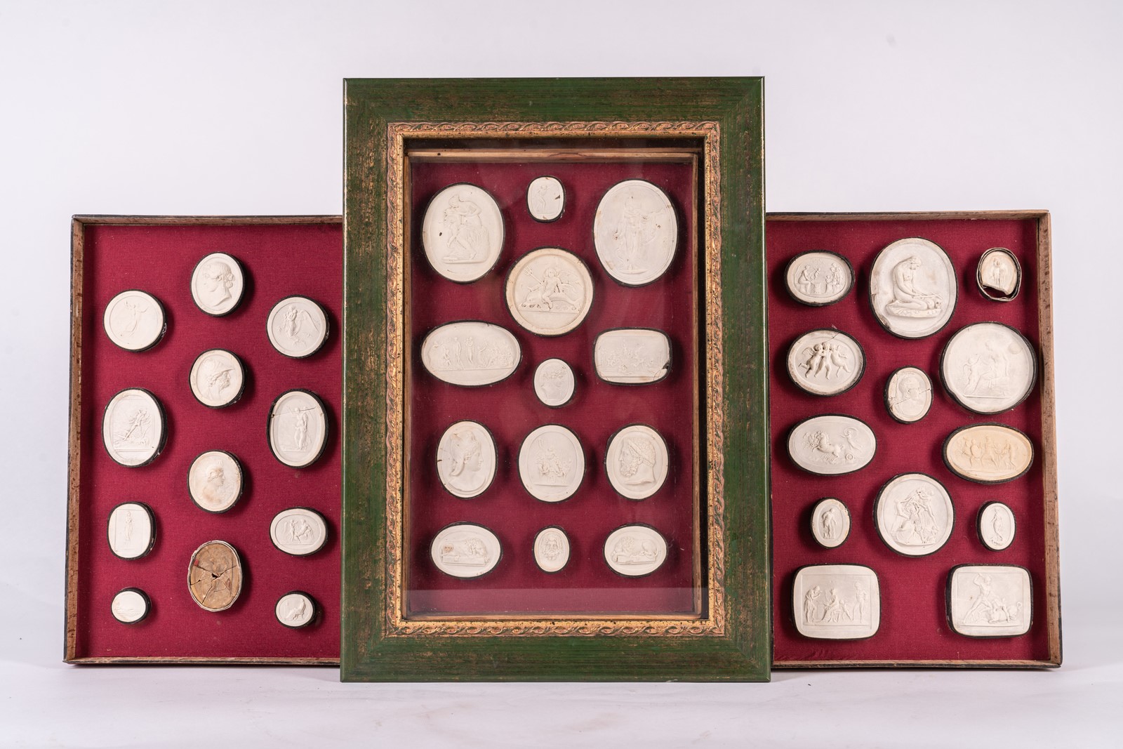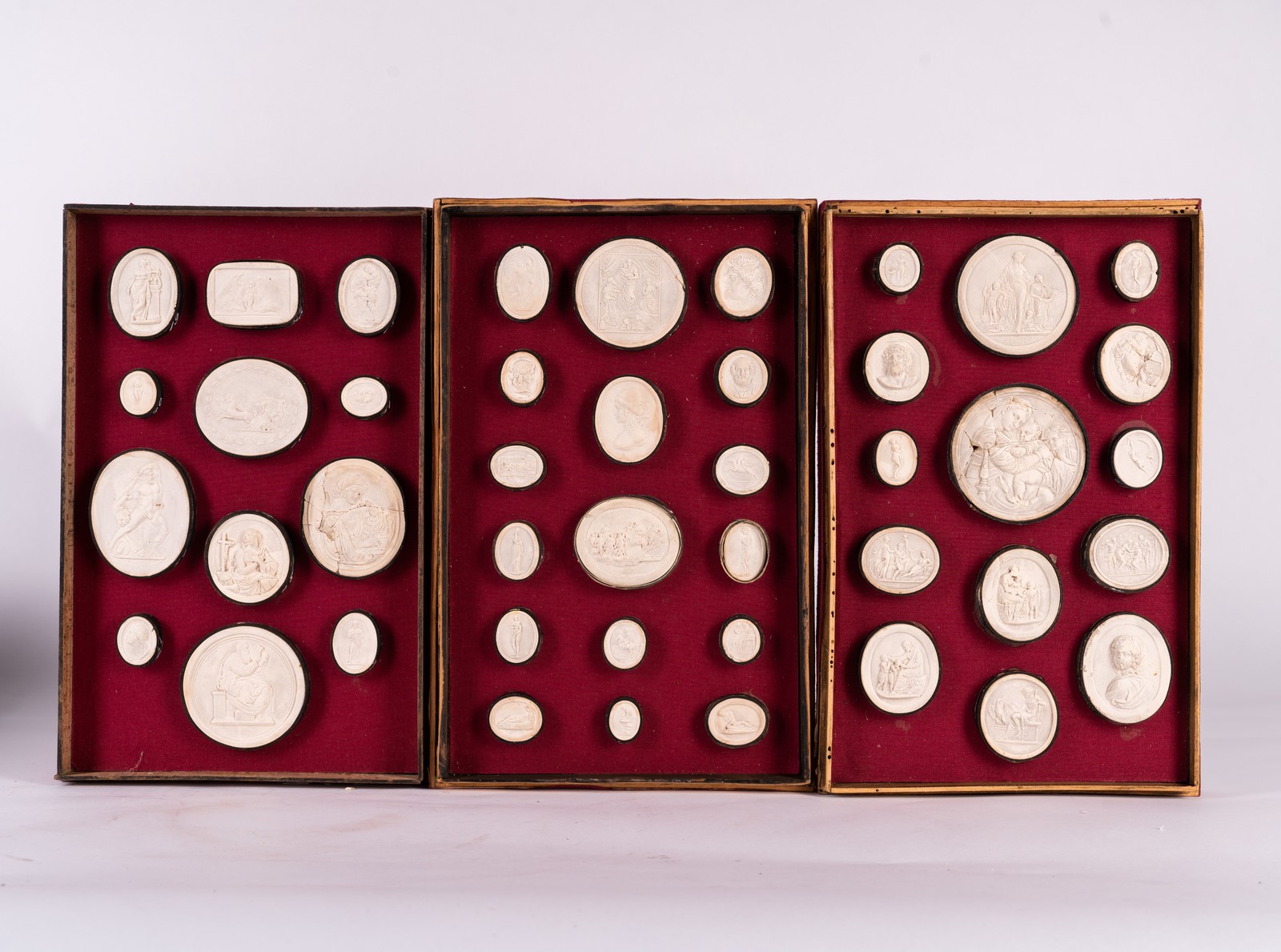MANIFATTURA ITALIANA DEL XIX SECOLO Gruppo di 82 medaglioni con soggetti classici in gesso contenuti in cinque teche di cui una incorniciata. . Cm 20,00 x 31,00. Misura scatola: 33,5x21,5 cm.
