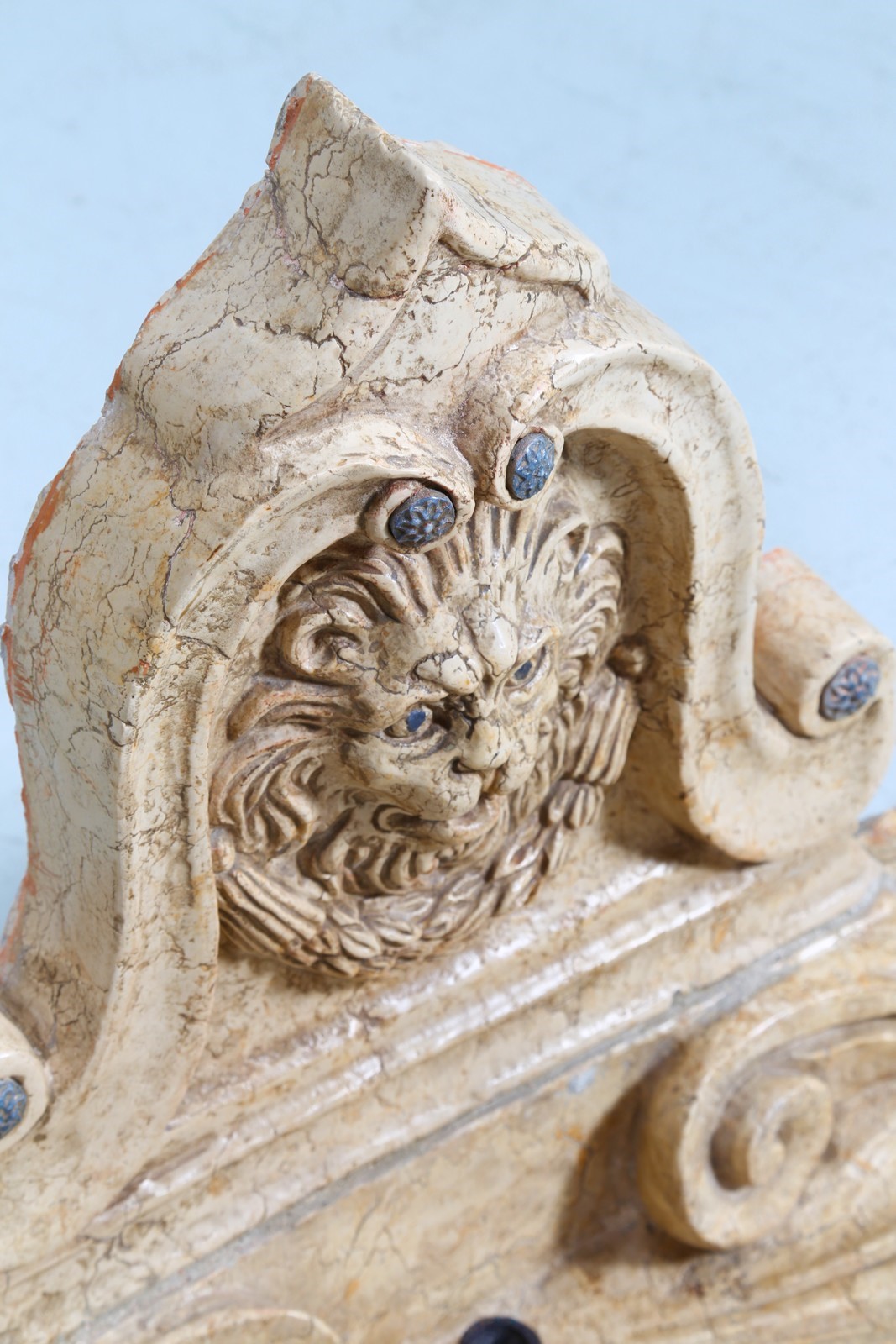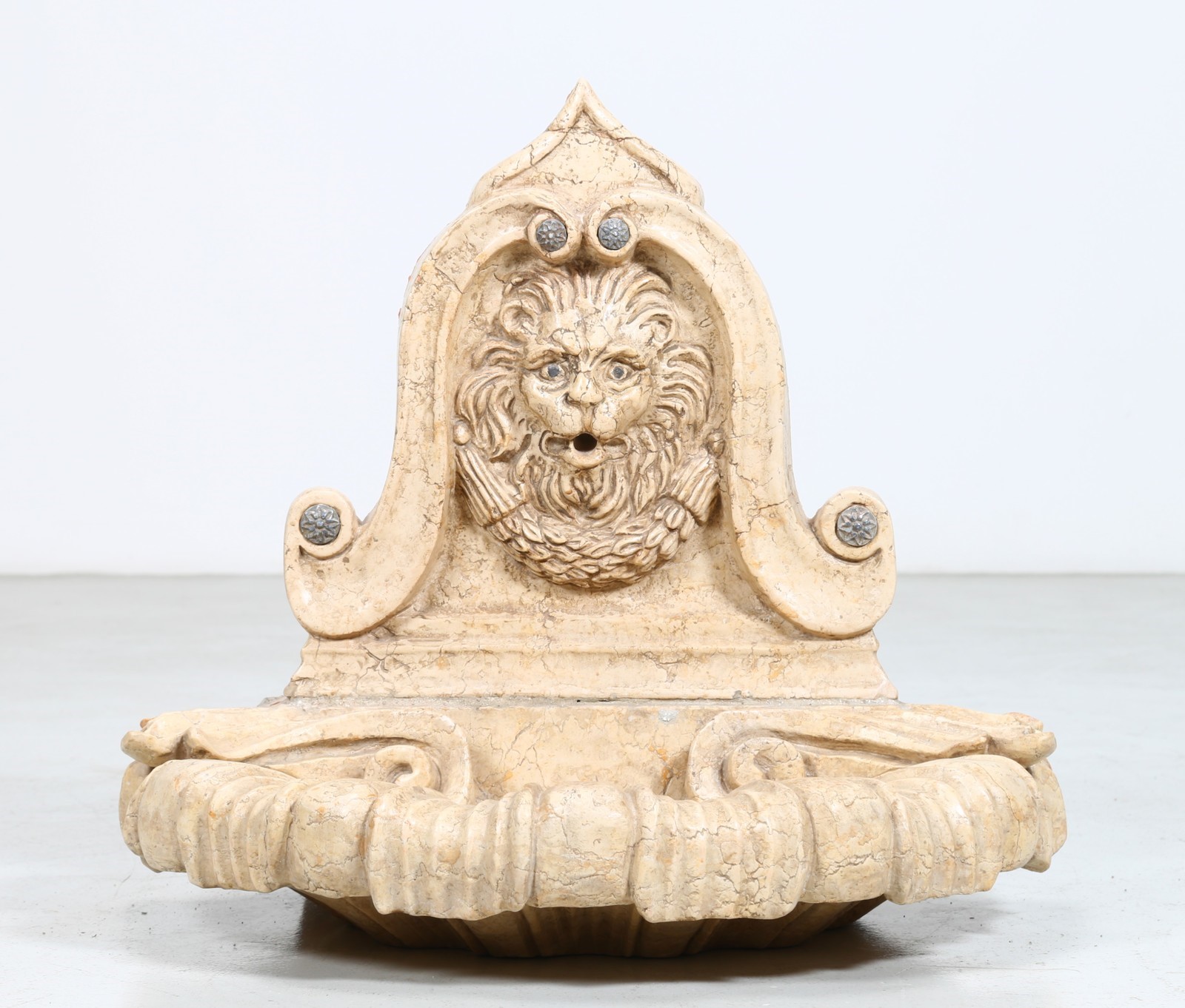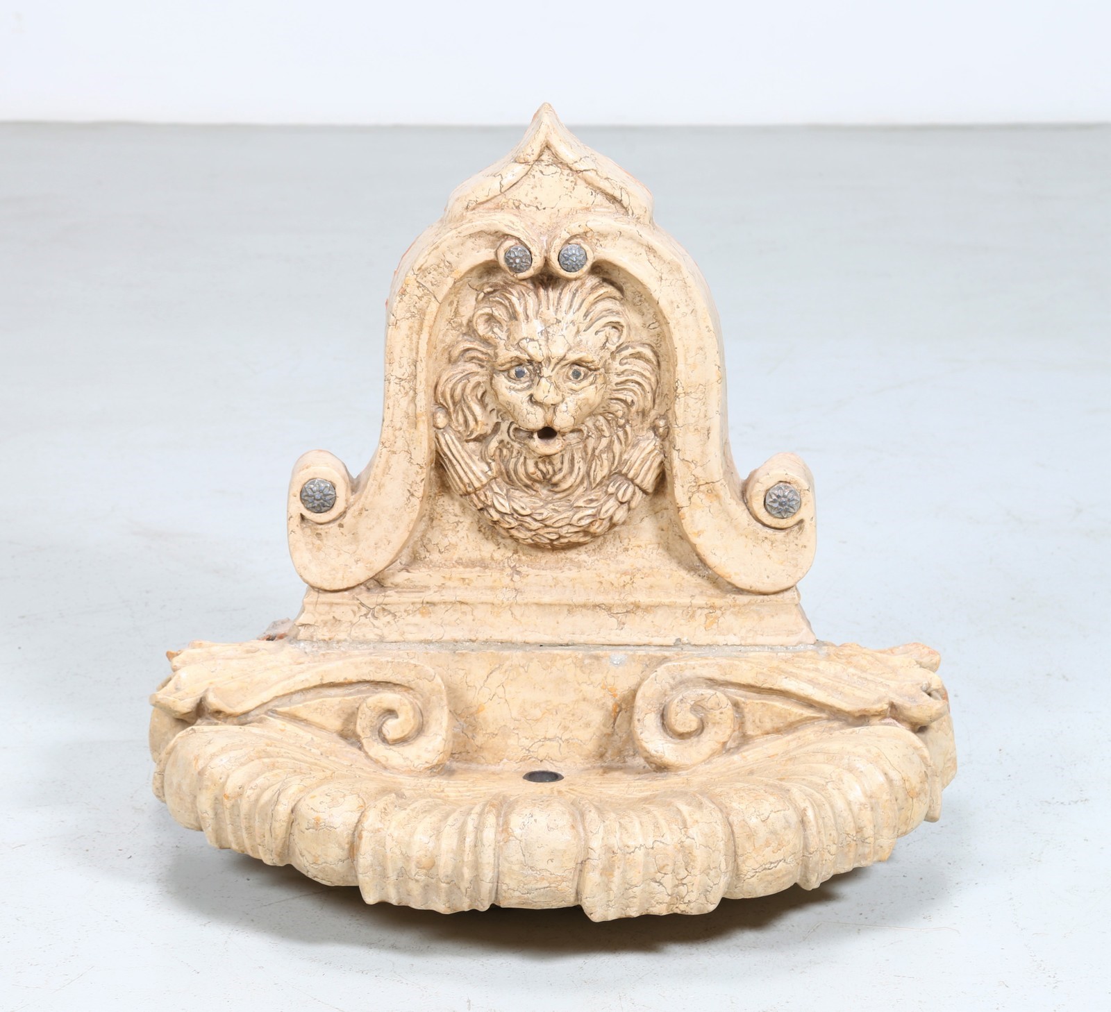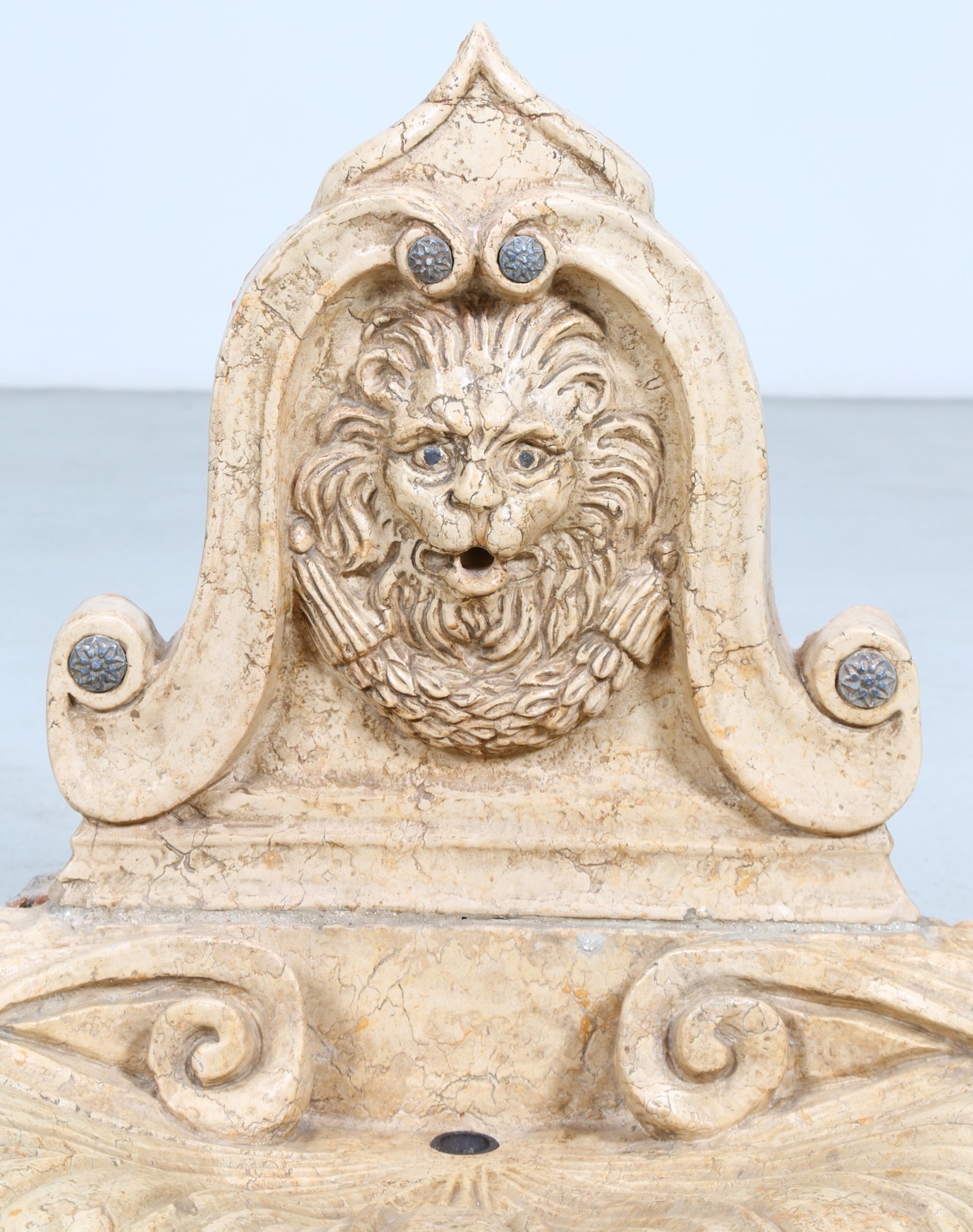 MANIFATTURA ITALIANA DEL XVII SECOLO Fontana in marmo decorata al centro con testa di leone. Marmo. Cm 75,00 x 75,00 x 60,00.