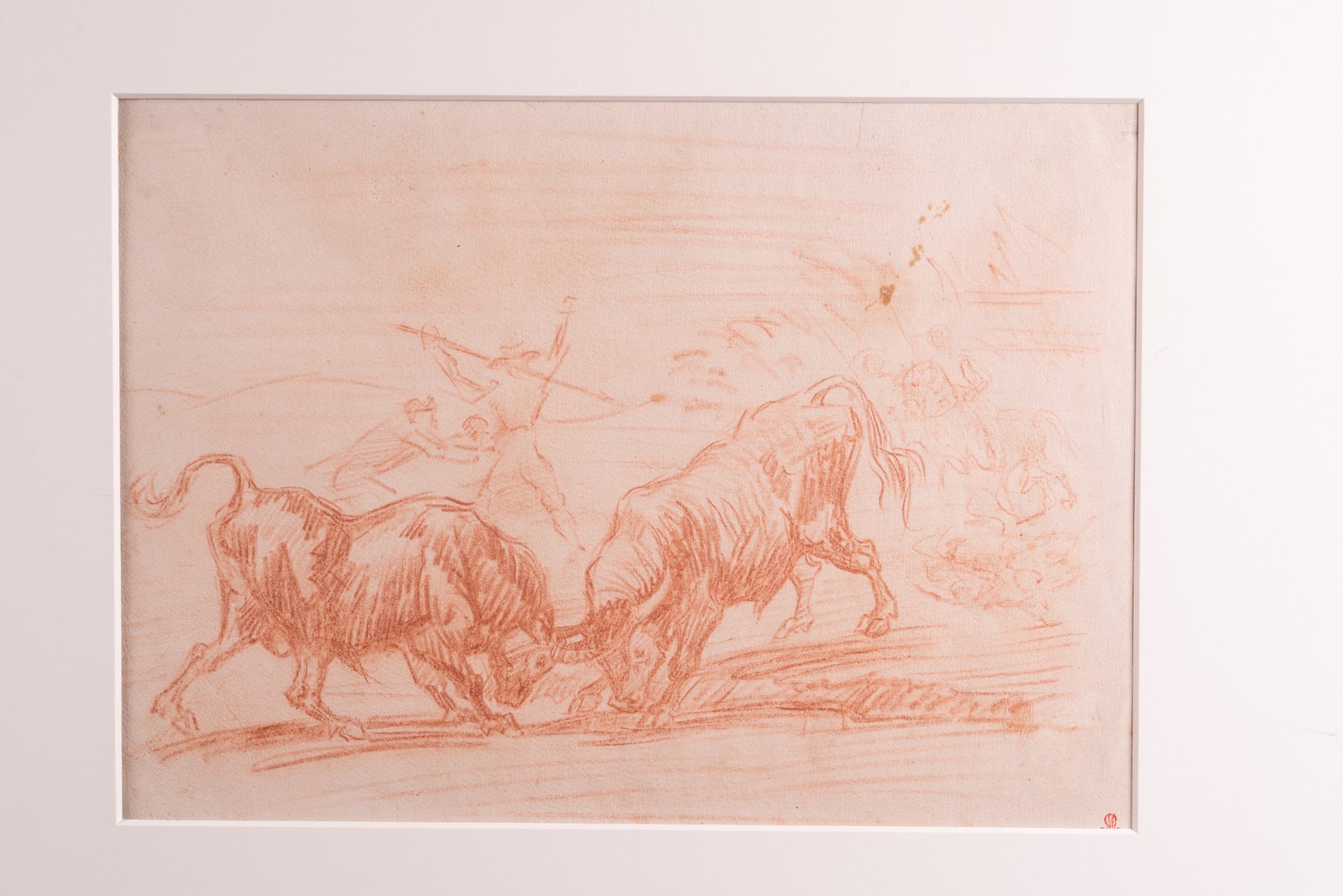 19th CENTURY ARTIST Clash of bulls. . Cm 36,00 x 26,00. Red crayon. Collection stamp lower right.