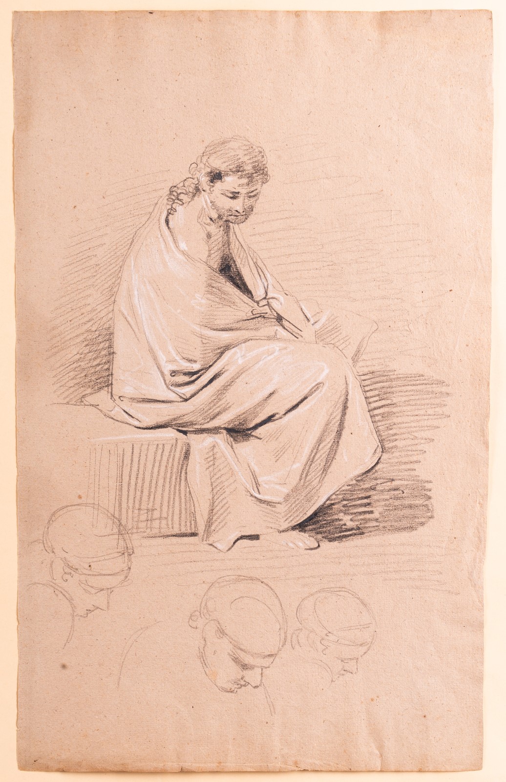 ARTISTA NEOCLASSICO Accademia d'uomo e studi di teste. Matita su carta. Cm 26,50 x 42,00. Matita di grafite, gessetto bianco, matita nera, tracce di inchiostro nero su carta beige.