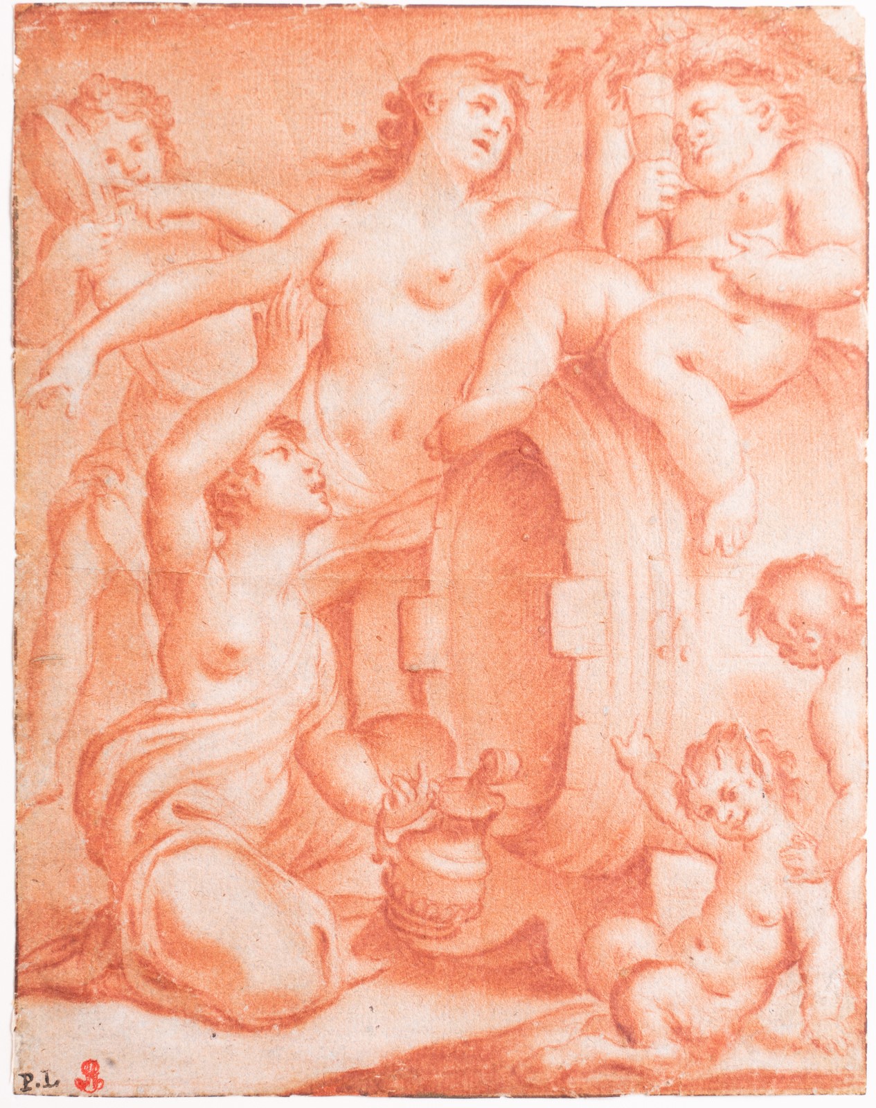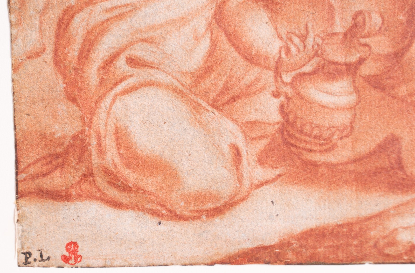 ARTISTA ITALIANO DELLA FINE DEL XVI SECOLO Ebbrezza di bacco, . . Cm 16,00 x 20,50. Sanguigna e tracce di lumeggiature a gesso bianco, al verso studi di zampe. Siglato P.L. e timbro di collezione in basso a sinistra. Presenza di filigrana.