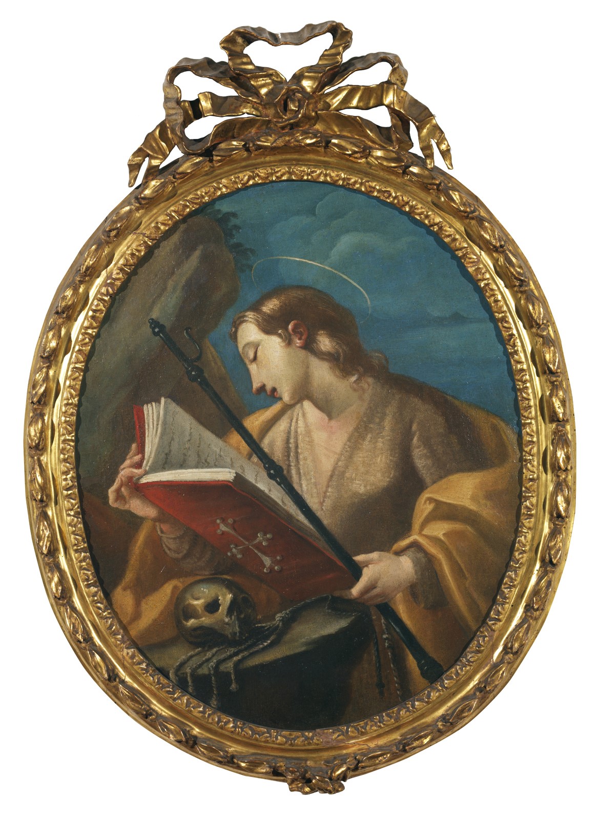 SCUOLA VENETA DEL XVIII SECOLO Evangelist. Oil on canvas . Cm 53,50 x 65,00. In golden frame. Cornice presente
